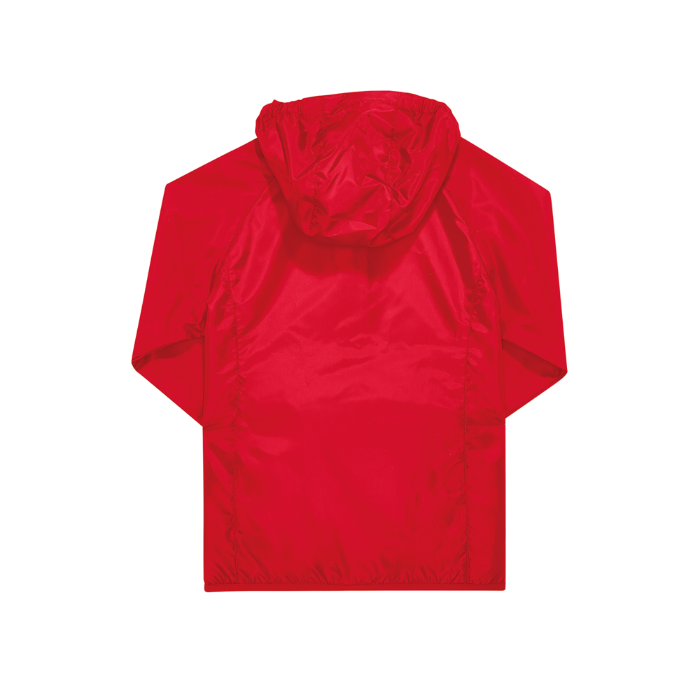 100% poliestere riciclato. Resistente all'acqua grazie al rivestimento DWR idrorepellente (Durable Water Repellent). Unisex, per diverse età. Maniche raglan, cappuccio con elastico per tenerlo fermo e fondo capo elasticizzato. Polsini semi elasticizzati. 2 tasche anteriori con zip.