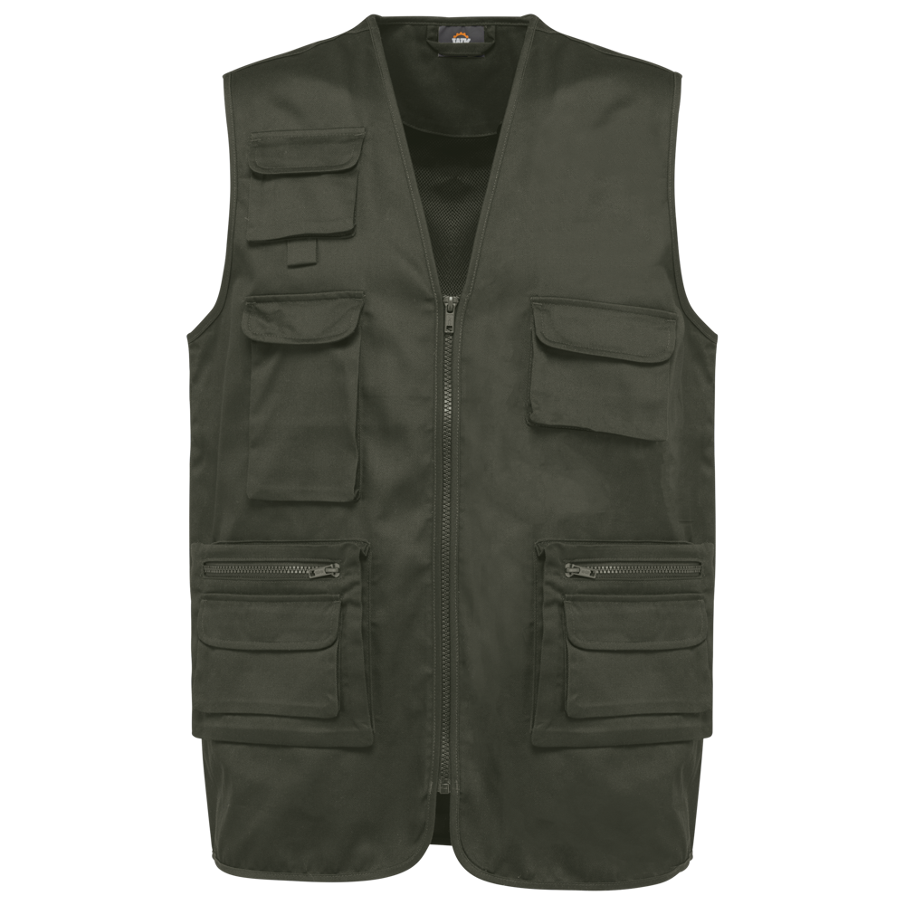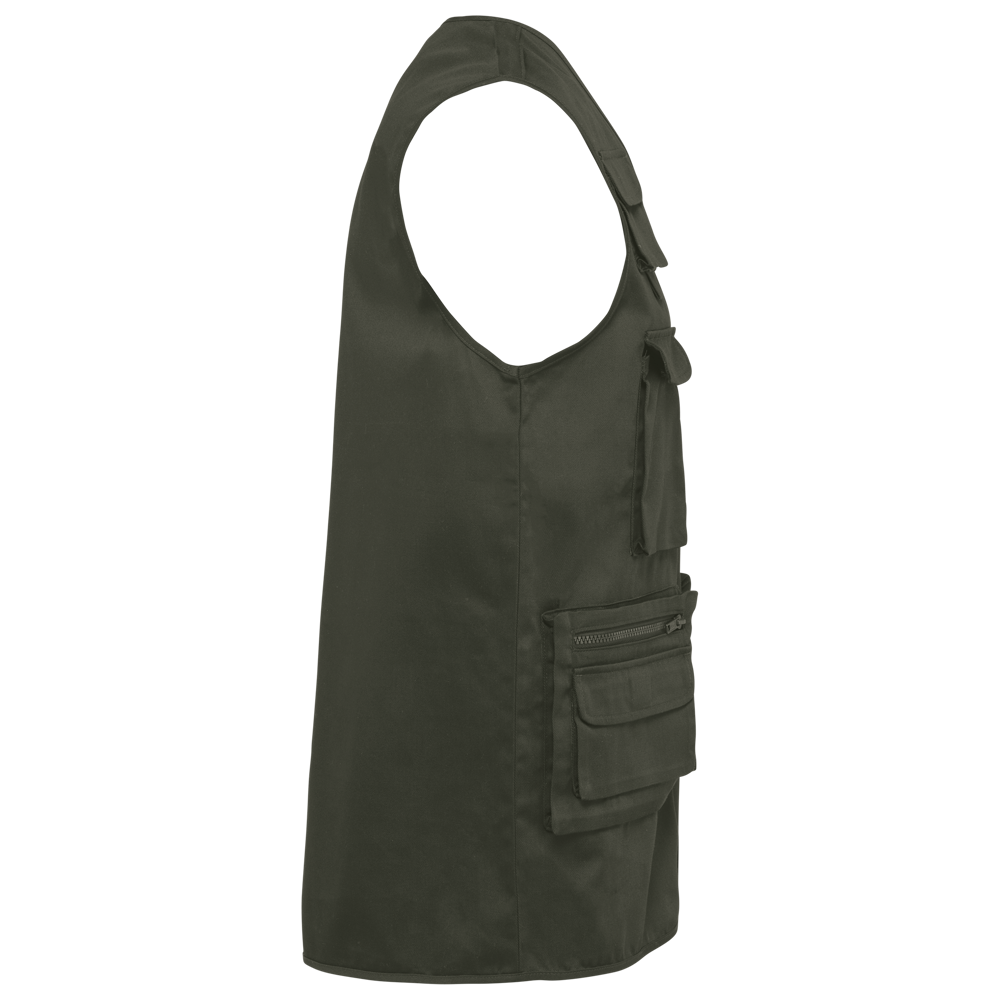 Esterno: 65% poliestere / 35% cotone. Fodera 100% poliestere. Taglio dritto. Fodera in rete su metà della parte posteriore. 2 tasche doppie applicate davanti, a soffietto, di cui 1 con patta e 1 con zip in plastica tono su tono + 3 tasche applicate a soffietto sul petto con patta, a strappo, di diverse taglie. Chiusura con zip in plastica tono su tono. Asola all'interno del collo per appendere il capo. Parte posteriore leggermente più lunga. Finitura con sbieco tono su tono sul giromanica e sui bordi del capo. Etichetta con il nome all'interno del capo. Etichetta con il nome del marchio staccabile.