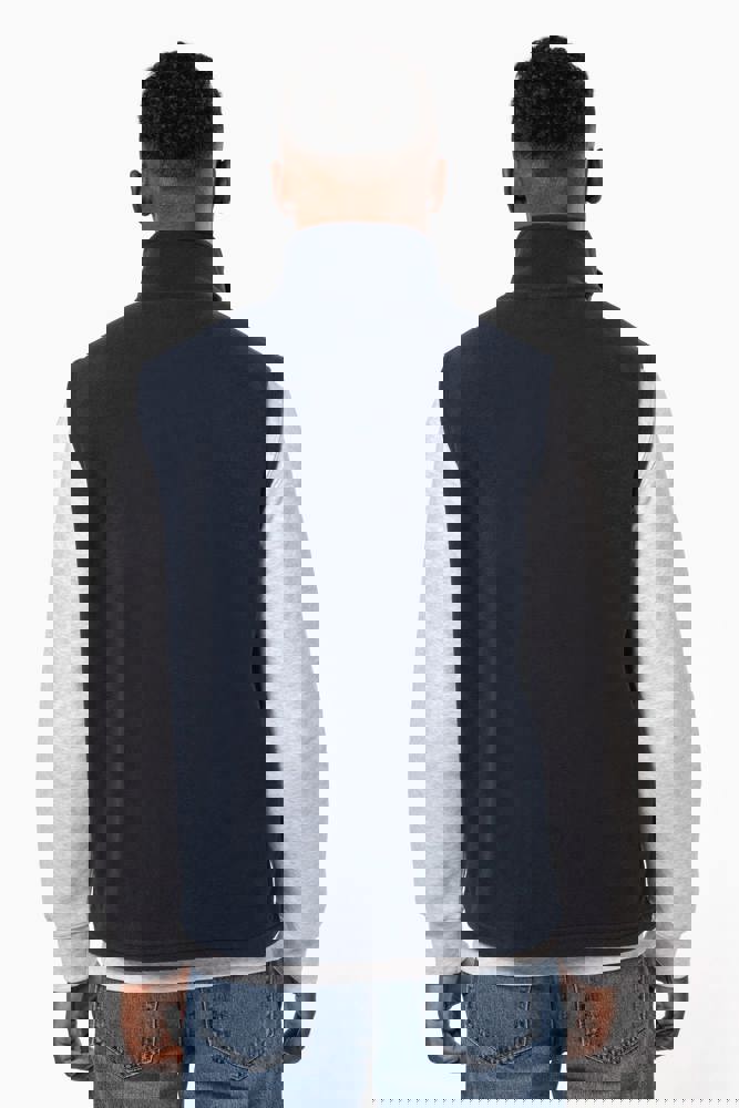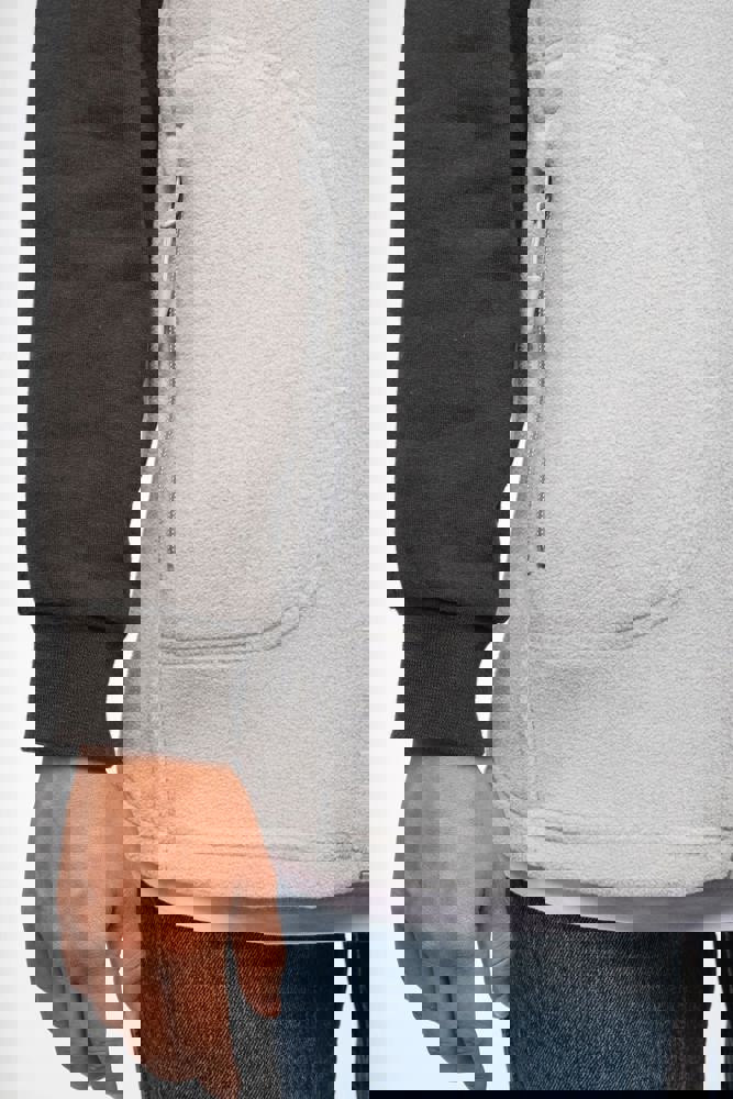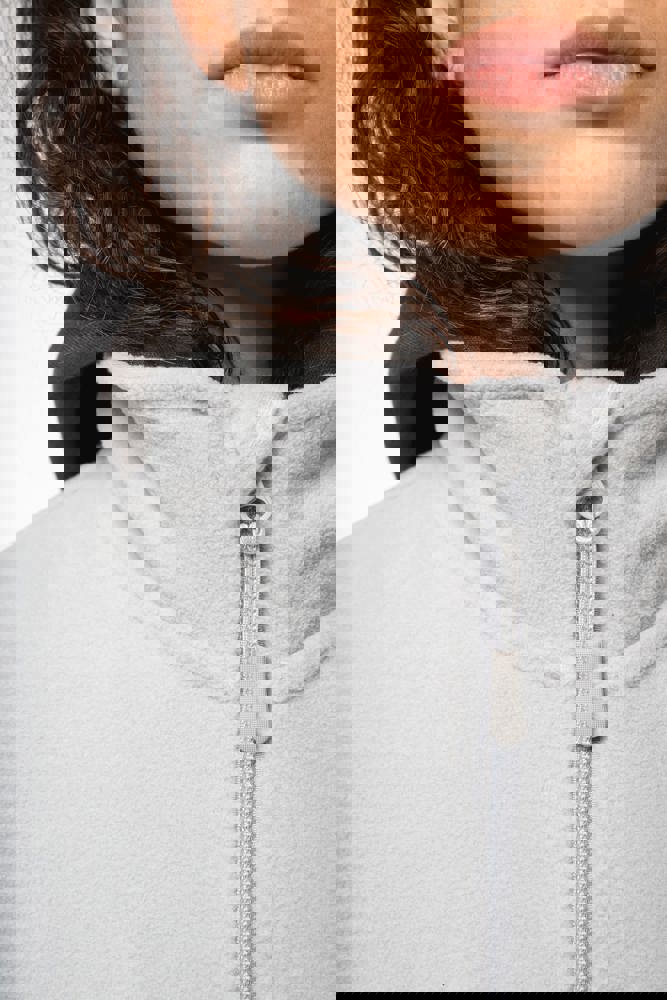 100% poliestere riciclato post-consumer. Micropile antipilling. Taglio regolare. 2 tasche con zip sul lato. Zip in nylon riciclato con cursore. Asola all'interno del collo per appendere il capo. Finiture a doppia impuntura intorno a tasche e fondo capo. Etichetta con il nome del marchio staccabile.