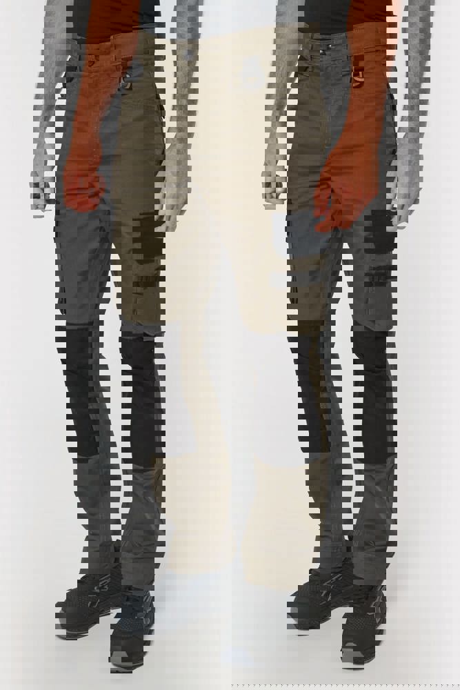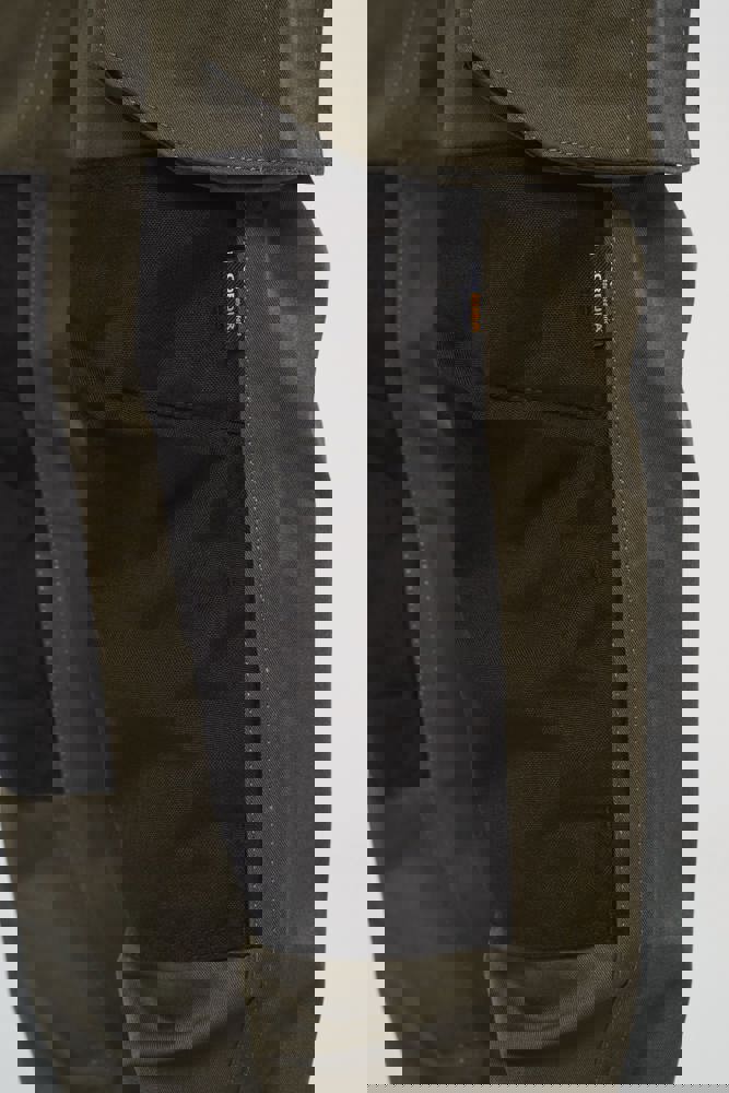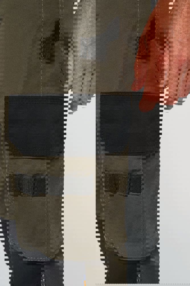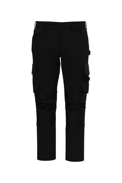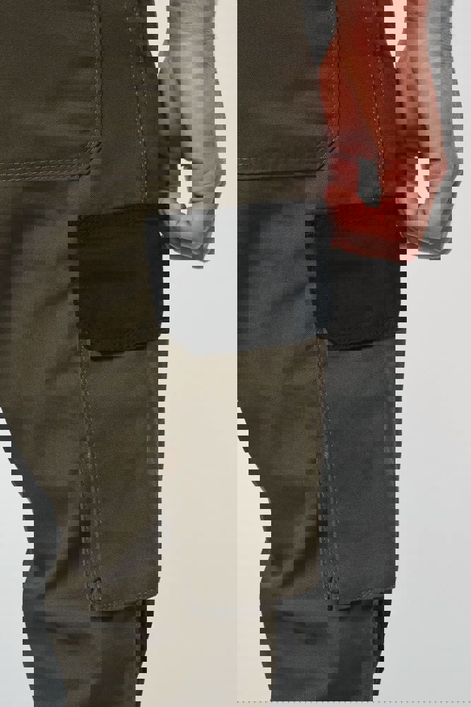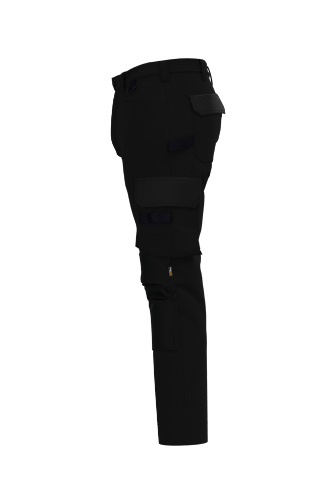 65% poliestere / 35% cotone. Lavaggio a 60 °C. Taglio dritto. 2 tasche frontali (sacco tasca nel tessuto principale) di cui 1 con taschina interna chiusa con patta a contrasto (tranne nel colore nero). 2 tasche cargo a soffietto, staccate dal pantalone negli angoli inferiori, dotate di patta a contrasto (tranne per il colore nero) con chiusura in velcro, di cui una con 2 scomparti e spazi per gli utensili. 2 tasche posteriori con patta e chiusura in velcro, 1 porta martello a sinistra. 2 tasche per ginocchiere in Cordura® a contrasto (colore nero per tutti i colori) con velcro e patta interna per mantenere in posizione ed adattare le ginocchiere. Girovita con passanti. Anello in plastica fissato sul girovita nella parte anteriore sinistra. Chiusura con bottone e zip (bottone in metallo ricoperto in plastica). Doppia cucitura sui fianchi, tripla cucitura sul centro davanti e dietro. Impunture a nervature nel cavallo. Cavallo 80 e orlo di 5 cm. Etichetta con il nome del marchio rimovibile. Ginocchiere NON fornite.