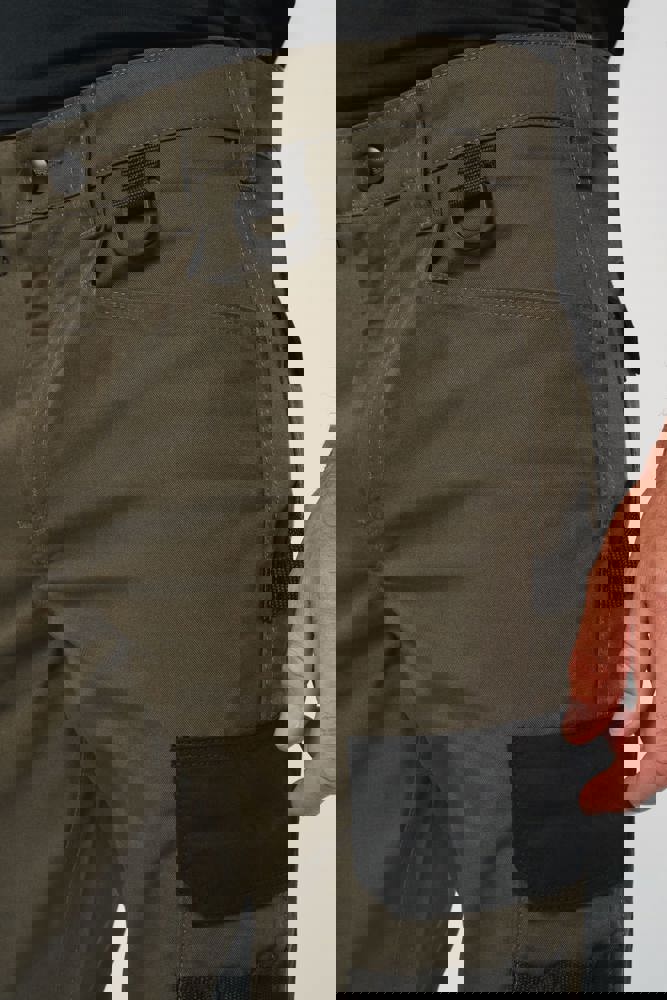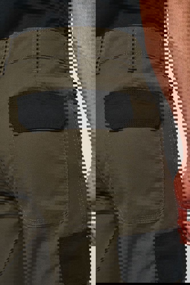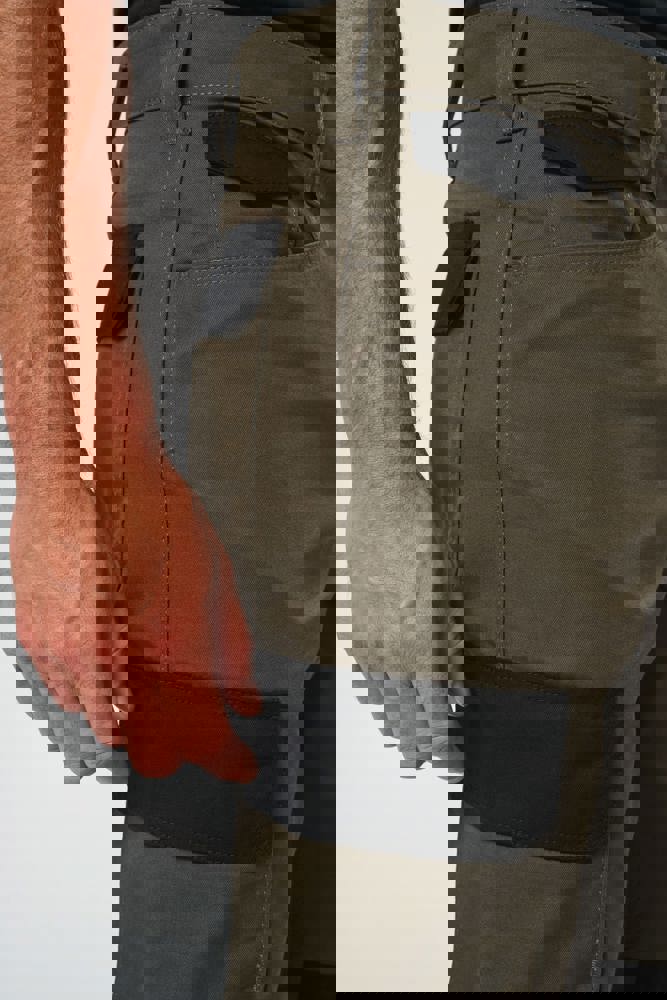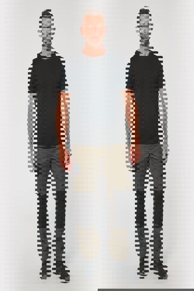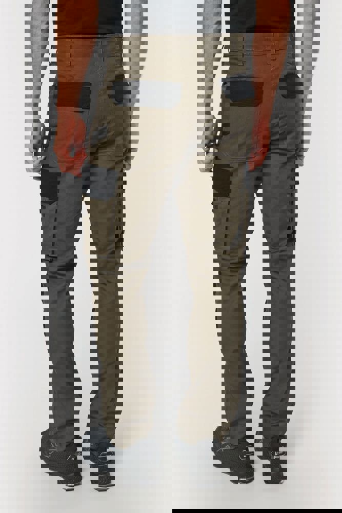 65% poliestere / 35% cotone. Lavaggio a 60 °C. Taglio dritto. 2 tasche frontali (sacco tasca nel tessuto principale) di cui 1 con taschina interna chiusa con patta a contrasto (tranne nel colore nero). 2 tasche cargo a soffietto, staccate dal pantalone negli angoli inferiori, dotate di patta a contrasto (tranne per il colore nero) con chiusura in velcro, di cui una con 2 scomparti e spazi per gli utensili. 2 tasche posteriori con patta e chiusura in velcro, 1 porta martello a sinistra. 2 tasche per ginocchiere in Cordura® a contrasto (colore nero per tutti i colori) con velcro e patta interna per mantenere in posizione ed adattare le ginocchiere. Girovita con passanti. Anello in plastica fissato sul girovita nella parte anteriore sinistra. Chiusura con bottone e zip (bottone in metallo ricoperto in plastica). Doppia cucitura sui fianchi, tripla cucitura sul centro davanti e dietro. Impunture a nervature nel cavallo. Cavallo 80 e orlo di 5 cm. Etichetta con il nome del marchio rimovibile. Ginocchiere NON fornite.