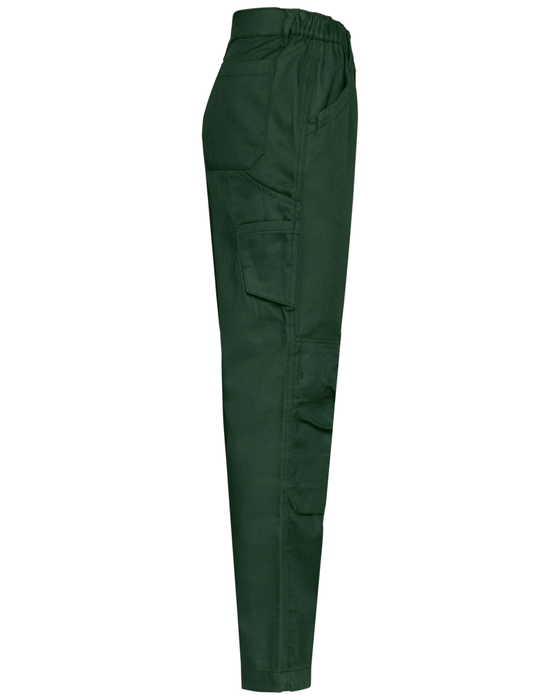 60% cotone / 40% poliestere. Tessuto pettinato. Lavaggio a 60 °C. Taglio dritto. 2 tasche frontali (sacco tasca nel tessuto principale). 1 tasca con patta e chiusura in velcro sul lato sinistro, 1 tasca doppia porta-utensili a destra, 2 tasche posteriori applicate, 2 tasche per ginocchiere tono su tono con velcro e patta interna per mantenere in posizione ed adattare le ginocchiere. Girovita in parte elasticizzato con passanti. Zip e bottone. Bottone in plastica. Soffietto sul cavallo per una maggiore resistenza e massima libertà di movimento. Doppia cucitura sui fianchi, tripla cucitura su soffietto e sul centro davanti/dietro. Impunture a nervature nel cavallo. Orlo a fondo gamba. Etichetta con il nome del marchio rimovibile. Ginocchiere NON fornite.