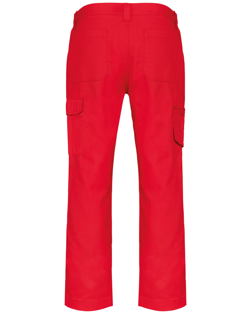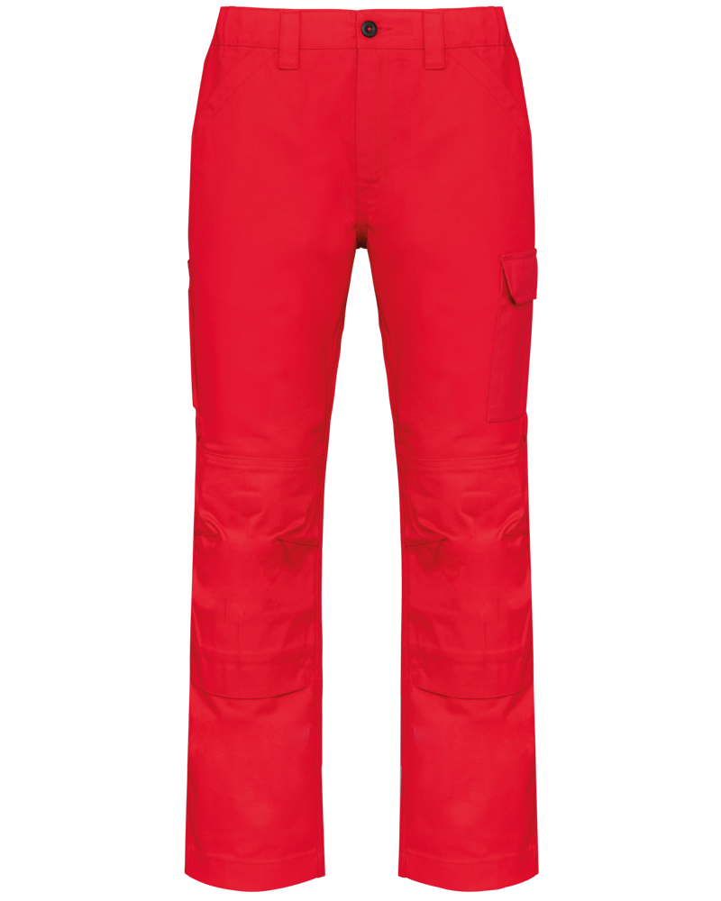 60% cotone / 40% poliestere. Tessuto pettinato. Lavaggio a 60 °C. Taglio dritto. 2 tasche frontali (sacco tasca nel tessuto principale). 1 tasca con patta e chiusura in velcro sul lato sinistro, 1 tasca doppia porta-utensili a destra, 2 tasche posteriori applicate, 2 tasche per ginocchiere tono su tono con velcro e patta interna per mantenere in posizione ed adattare le ginocchiere. Girovita in parte elasticizzato con passanti. Zip e bottone. Bottone in plastica. Soffietto sul cavallo per una maggiore resistenza e massima libertà di movimento. Doppia cucitura sui fianchi, tripla cucitura su soffietto e sul centro davanti/dietro. Impunture a nervature nel cavallo. Orlo a fondo gamba. Etichetta con il nome del marchio rimovibile. Ginocchiere NON fornite.