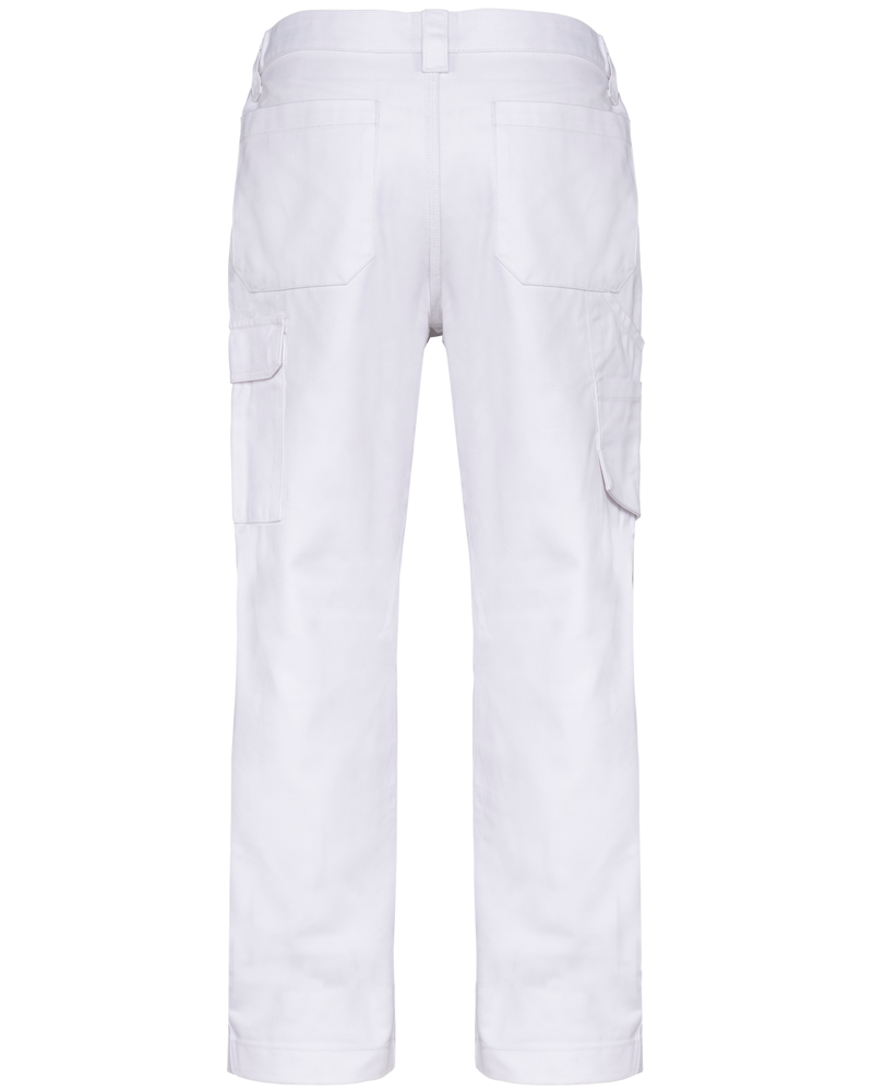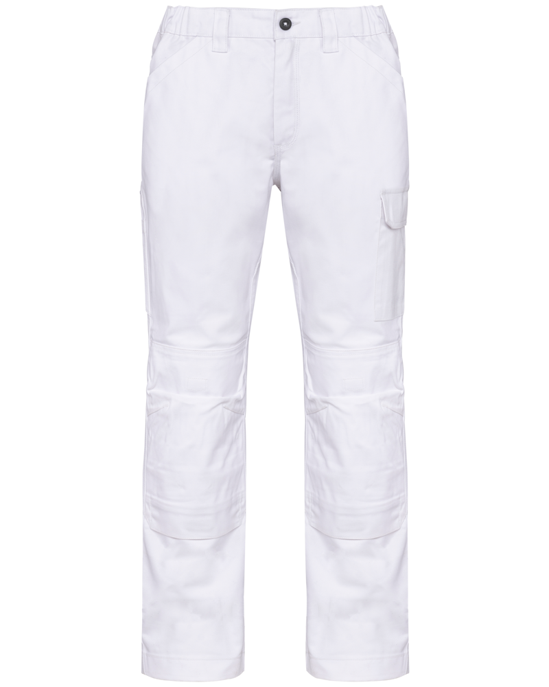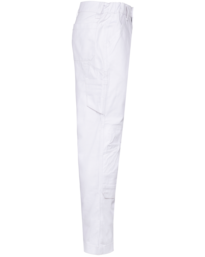 60% cotone / 40% poliestere. Tessuto pettinato. Lavaggio a 60 °C. Taglio dritto. 2 tasche frontali (sacco tasca nel tessuto principale). 1 tasca con patta e chiusura in velcro sul lato sinistro, 1 tasca doppia porta-utensili a destra, 2 tasche posteriori applicate, 2 tasche per ginocchiere tono su tono con velcro e patta interna per mantenere in posizione ed adattare le ginocchiere. Girovita in parte elasticizzato con passanti. Zip e bottone. Bottone in plastica. Soffietto sul cavallo per una maggiore resistenza e massima libertà di movimento. Doppia cucitura sui fianchi, tripla cucitura su soffietto e sul centro davanti/dietro. Impunture a nervature nel cavallo. Orlo a fondo gamba. Etichetta con il nome del marchio rimovibile. Ginocchiere NON fornite.