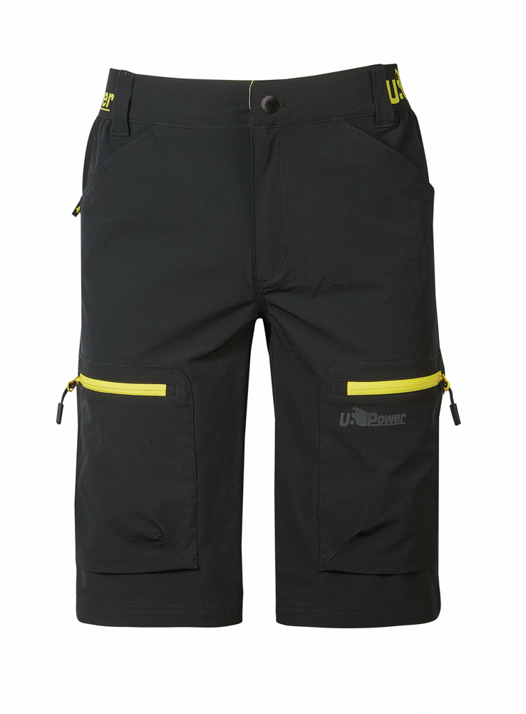 86% nylon, 14% spandex. Bermuda da lavoro con taglio da jogging e vita elasticizzata per garantire comfort e benessere durante l'intera giornata lavorativa. Bermuda stretch in tessuto U-4 way che si allunga contemporaneamente in quattro direzioni opposte per assecondare i movimenti del corpo. Chiusura centrale con zip e bottone in gomma anti-graffio. Bermuda multi-tasche con due tasche sul davanti, due tasche multifunzione con zip, due tasche posteriori, di cui una con zip e una con velcro, una tasca per il metro e un passante porta martello. Il design con pannello posteriore accentuato garantisce una maggiore protezione della zona lombare, mentre la striscia riflettente sul passante tubolare aumenta la visibilità. Bermuda traspirante e ad asciugatura rapida in tessuto impermeabile, ideale per la stagione calda.