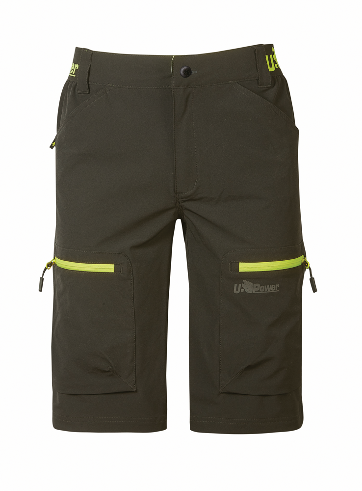 86% nylon, 14% spandex. Bermuda da lavoro con taglio da jogging e vita elasticizzata per garantire comfort e benessere durante l'intera giornata lavorativa. Bermuda stretch in tessuto U-4 way che si allunga contemporaneamente in quattro direzioni opposte per assecondare i movimenti del corpo. Chiusura centrale con zip e bottone in gomma anti-graffio. Bermuda multi-tasche con due tasche sul davanti, due tasche multifunzione con zip, due tasche posteriori, di cui una con zip e una con velcro, una tasca per il metro e un passante porta martello. Il design con pannello posteriore accentuato garantisce una maggiore protezione della zona lombare, mentre la striscia riflettente sul passante tubolare aumenta la visibilità. Bermuda traspirante e ad asciugatura rapida in tessuto impermeabile, ideale per la stagione calda.