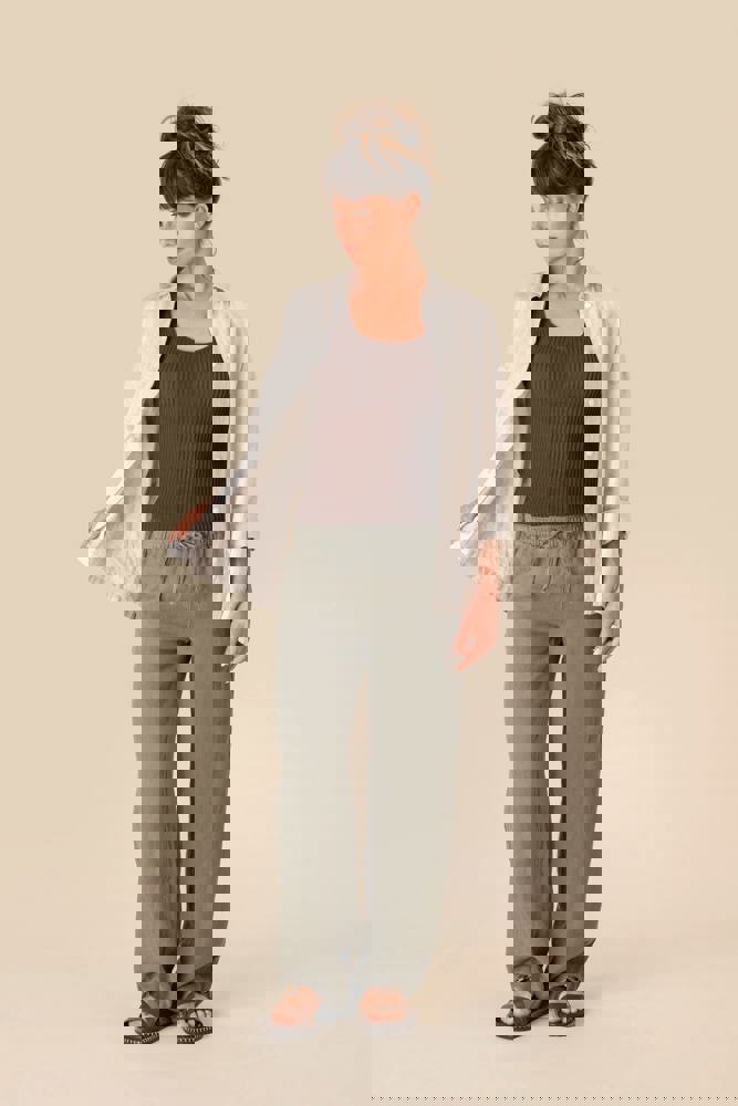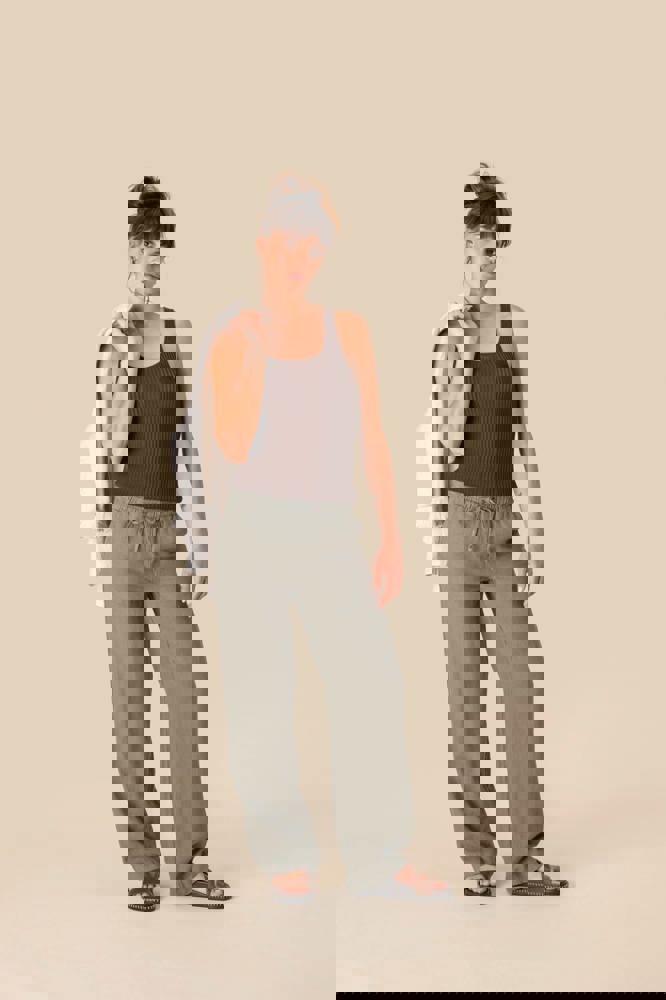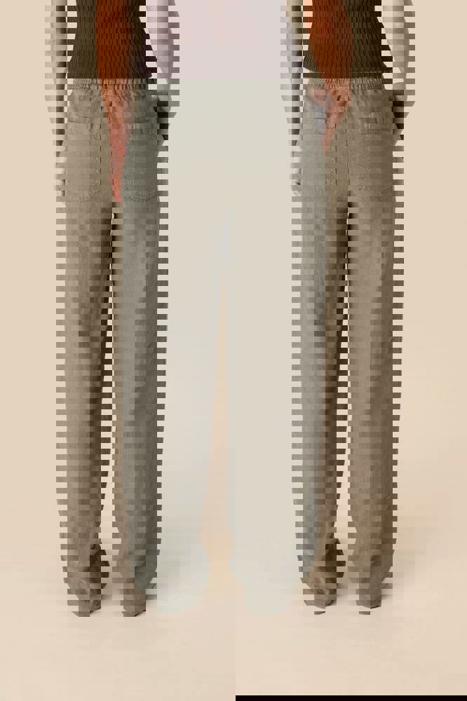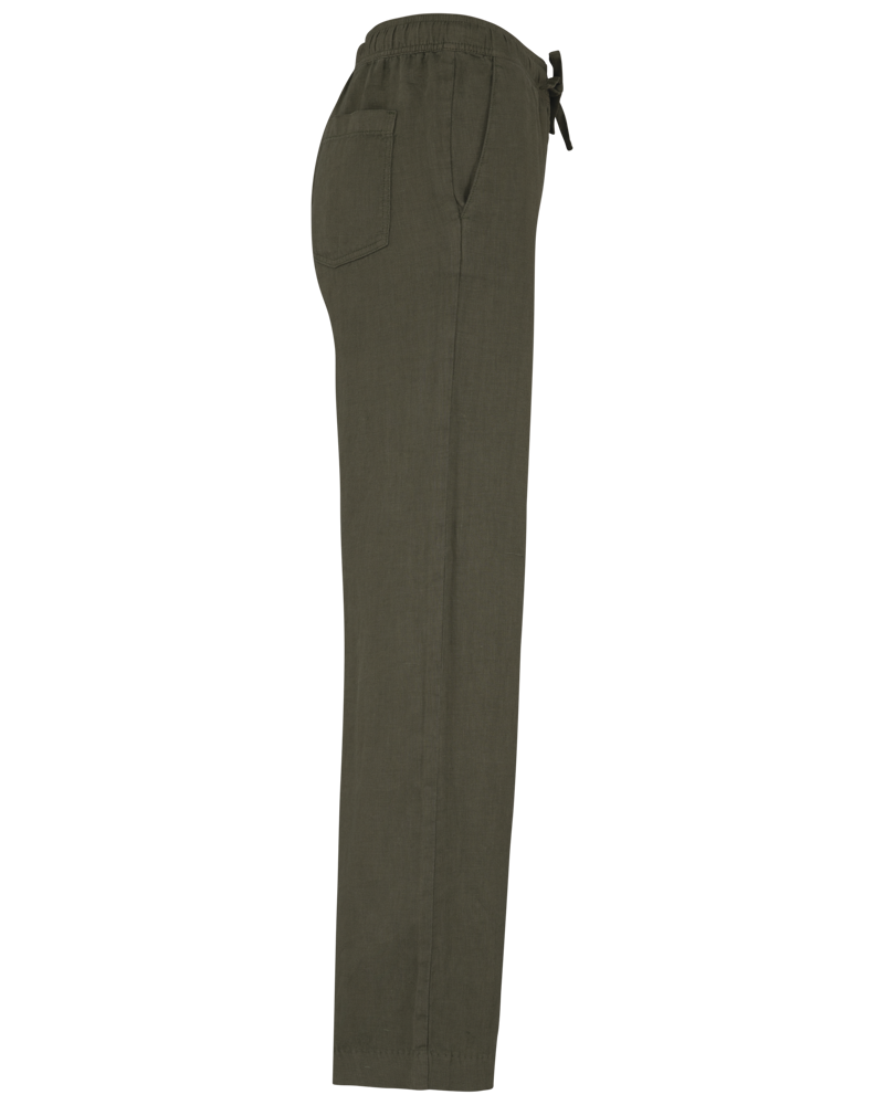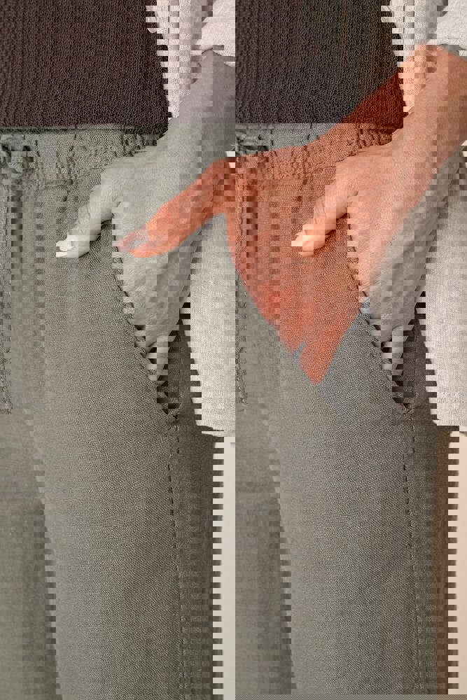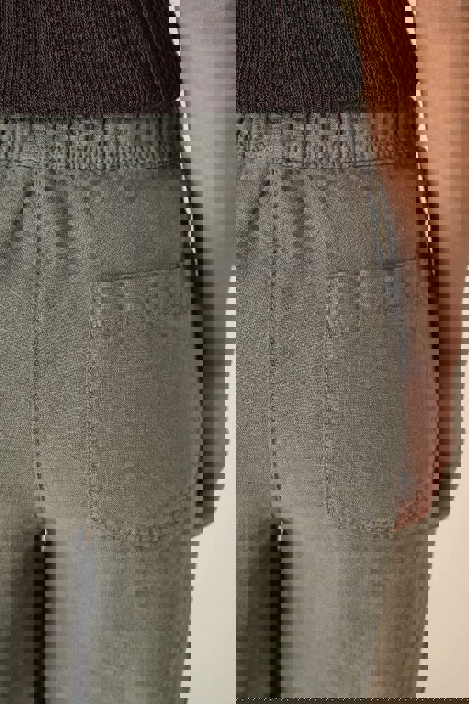 100% lino. Tessuto. Aspetto slavato. Taglio ampio. Girovita con impunture, elasticizzato con coulisse piatta nel tessuto principale tono su tono. Occhielli ricamati. Interno girovita con sbieco tono su tono. Tasca laterale rifinita con cucitura a nervatura. Centro davanti e dietro con cucitura a nervatura di rinforzo. Tasche posteriori applicate, con impunture. Orlo invisibile a fondo capo. Indumento tinto in capo dopo la confezione. Questa tecnica può comportare variazioni di colore da un prodotto all’altro. Indumento tinto in capo dopo la confezione: i colori possono variare leggermente da un prodotto all'altro. Il prodotto potrebbe stingere a contatto con superfici o capi chiari.