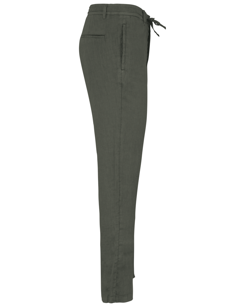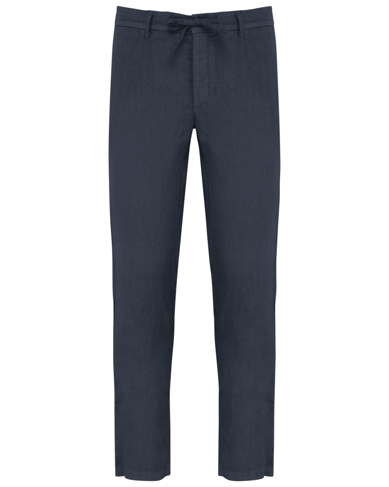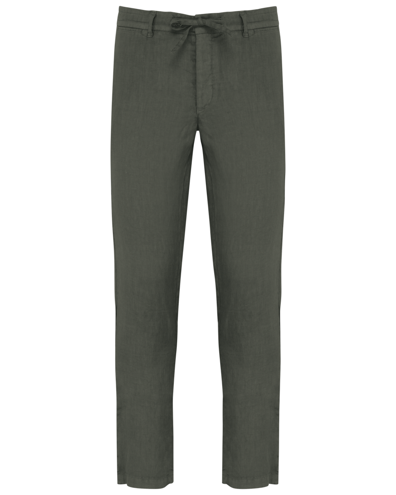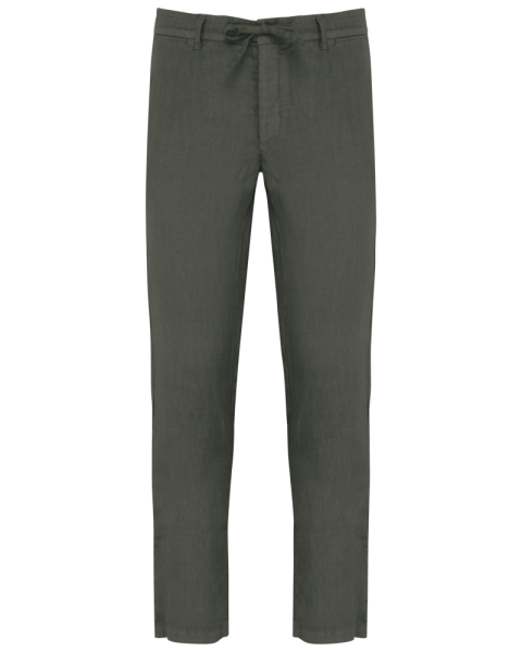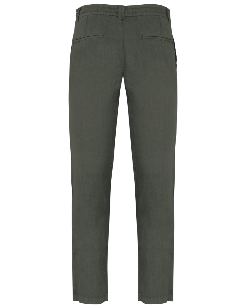 100% lino. Tessuto. Aspetto slavato. Impuntura sul girovita con coulisse piatta nel tessuto principale tono su tono e occhiello ricamato. Interno girovita con sbieco tono su tono e passanti davanti e dietro. Patta di chiusura con impuntura e bottoni in plastica riciclata tono su tono. Due tasche a filetto laterali e dietro, più un taschino portamonete a destra. Cucitura a nervatura davanti e dietro per un maggior rinforzo. Orlo a impuntura semplice a fondo capo. Indumento tinto in capo dopo la confezione: i colori possono variare leggermente da un prodotto all'altro. Il prodotto potrebbe stingere a contatto con superfici o capi chiari.