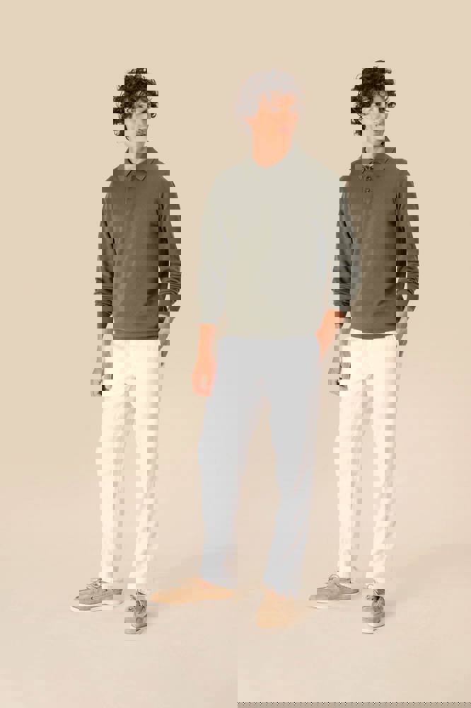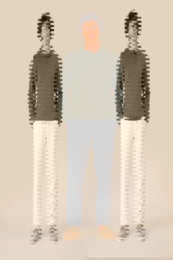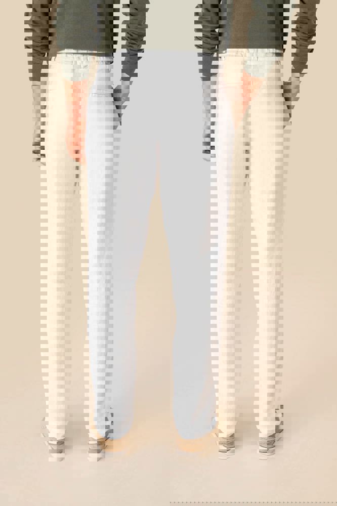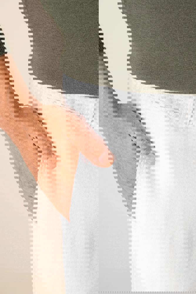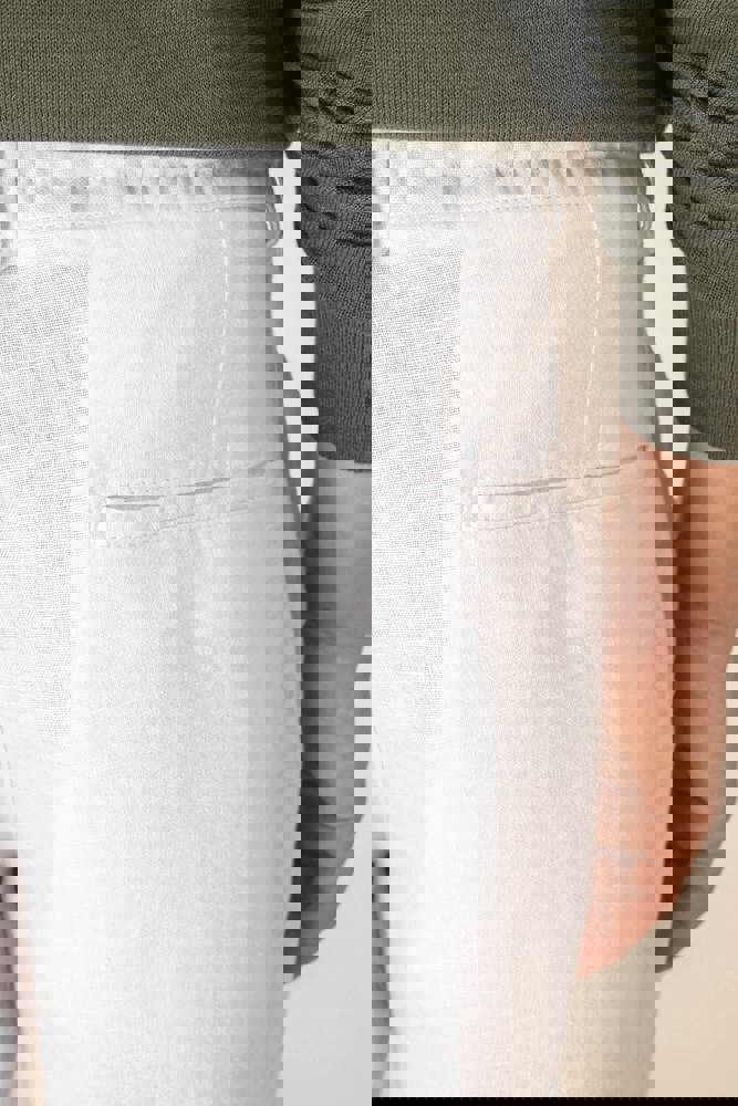 100% lino. Tessuto. Aspetto slavato. Impuntura sul girovita con coulisse piatta nel tessuto principale tono su tono e occhiello ricamato. Interno girovita con sbieco tono su tono e passanti davanti e dietro. Patta di chiusura con impuntura e bottoni in plastica riciclata tono su tono. Due tasche a filetto laterali e dietro, più un taschino portamonete a destra. Cucitura a nervatura davanti e dietro per un maggior rinforzo. Orlo a impuntura semplice a fondo capo. Indumento tinto in capo dopo la confezione: i colori possono variare leggermente da un prodotto all'altro. Il prodotto potrebbe stingere a contatto con superfici o capi chiari.