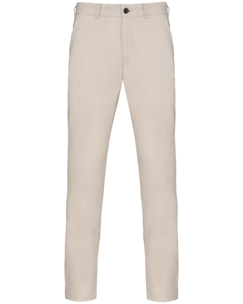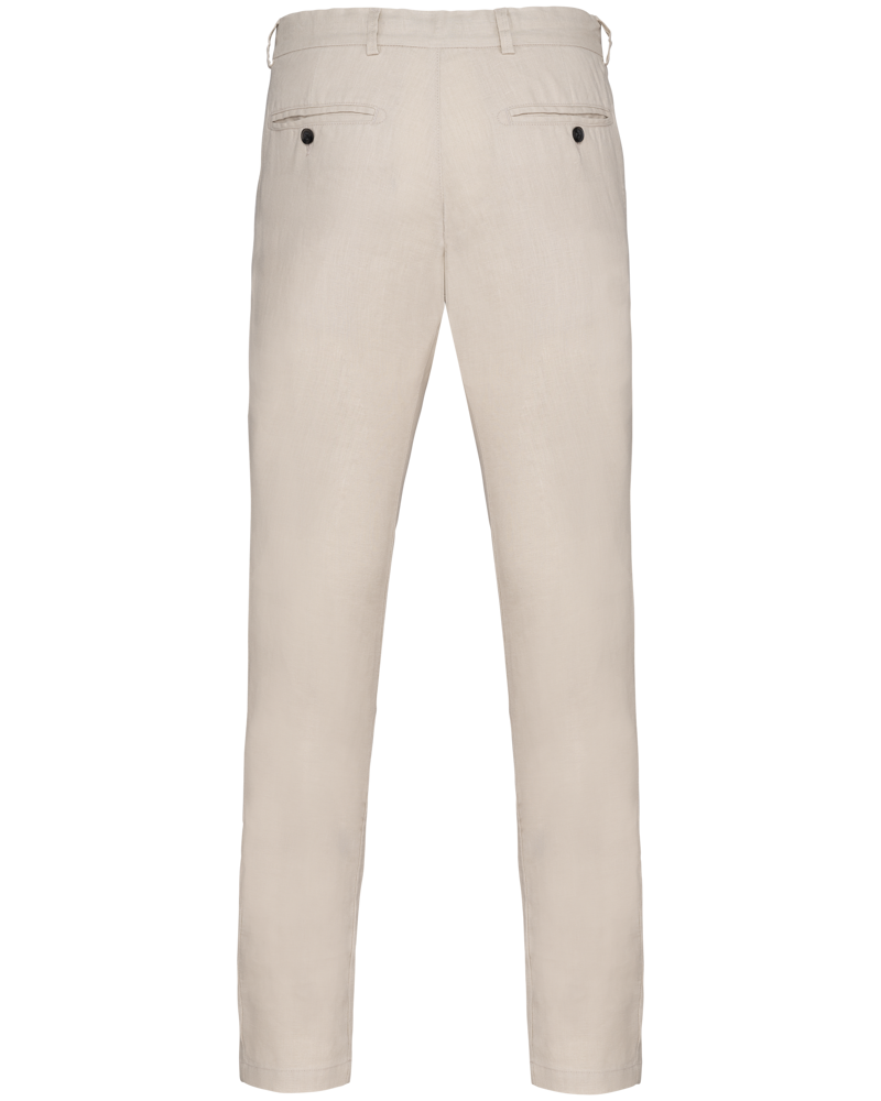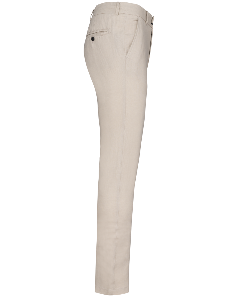 100% lino. Tessuto. Girovita con passanti e finitura interna inglese a contrasto di colore blu navy. Patta con bottoni in plastica riciclata effetto marmo e zip in metallo riciclato. Due tasche sul davanti con impuntura. Due tasche a filetto dietro con bottone in plastica riciclata effetto marmo. Fondo tasca davanti e dietro a motivo spigato tono su tono. Cucitura a nervatura davanti e dietro per un maggior rinforzo. Finitura a fondo gamba con orlo a impuntura semplice. Capo lavato dopo il montaggio: i colori possono variare da un prodotto all'altro.