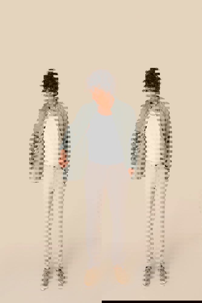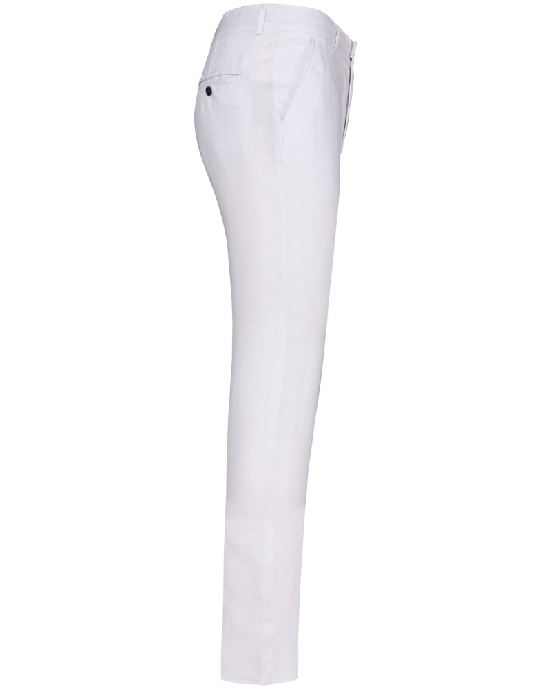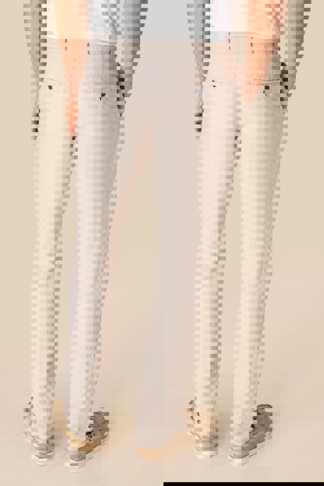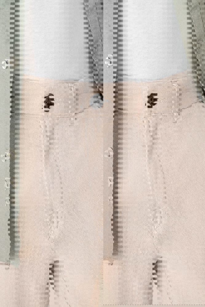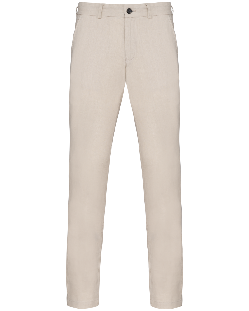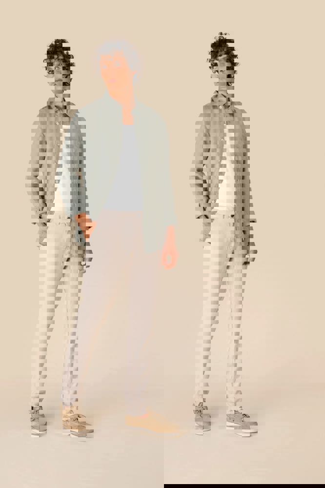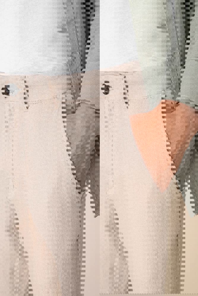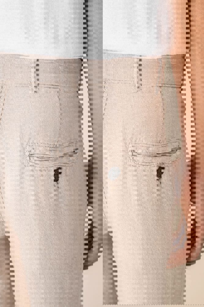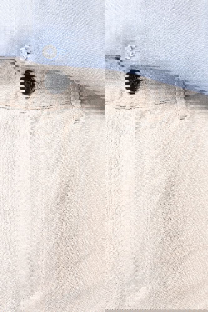 100% lino. Tessuto. Girovita con passanti e finitura interna inglese a contrasto di colore blu navy. Patta con bottoni in plastica riciclata effetto marmo e zip in metallo riciclato. Due tasche sul davanti con impuntura. Due tasche a filetto dietro con bottone in plastica riciclata effetto marmo. Fondo tasca davanti e dietro a motivo spigato tono su tono. Cucitura a nervatura davanti e dietro per un maggior rinforzo. Finitura a fondo gamba con orlo a impuntura semplice. Capo lavato dopo il montaggio: i colori possono variare da un prodotto all'altro.