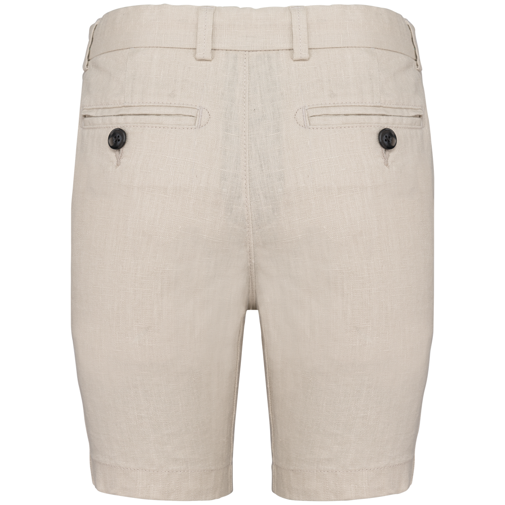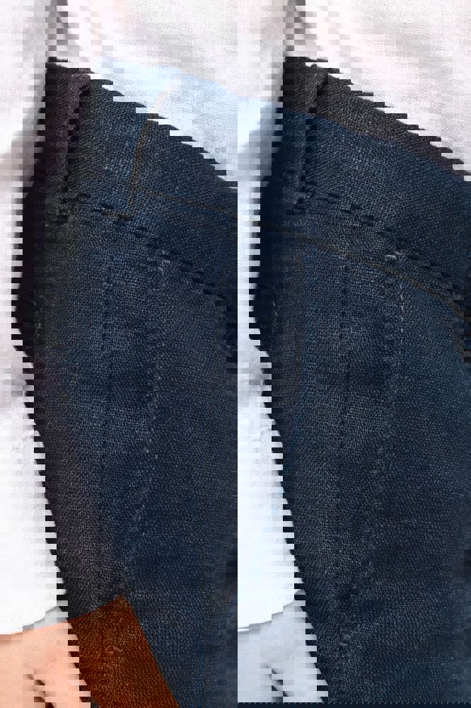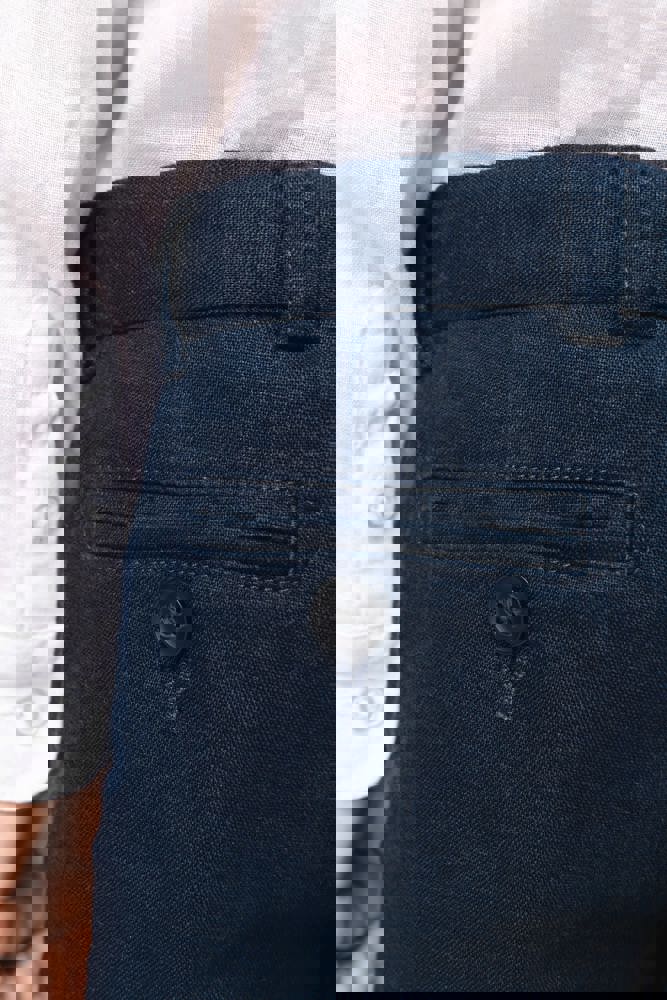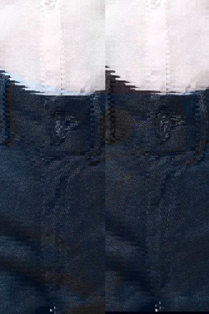 100% lino. Tessuto. Vita con passanti, interno elasticizzato e regolabile. Girovita con finitura interna inglese a contrasto di colore blu navy. Patta con bottoni in plastica riciclata effetto marmo e zip in metallo riciclato. Due tasche sul davanti con impuntura. Due tasche a filetto dietro con bottone in plastica riciclata effetto marmo. Fondo tasca davanti e dietro a motivo spigato tono su tono. Cucitura a nervatura davanti e dietro per un maggior rinforzo. Finitura a fondo gamba con orlo a impuntura semplice. Capo lavato dopo il montaggio: i colori possono variare da un prodotto all'altro.