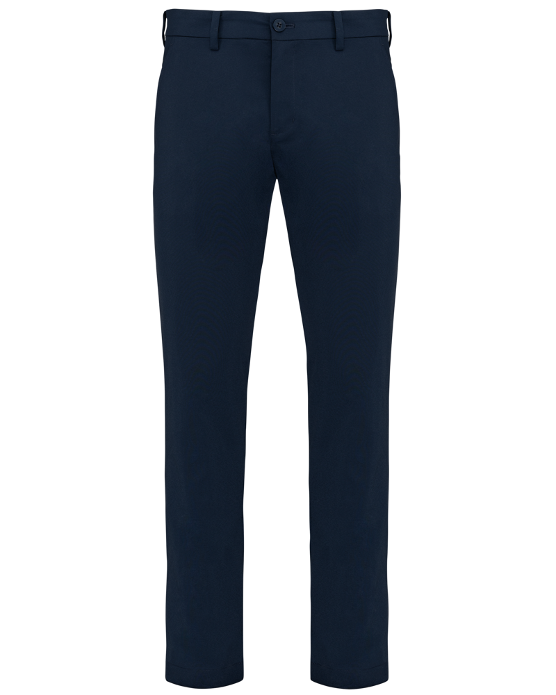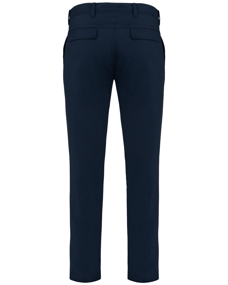 96% Poliestere / 4% Elastan. Tessuto morbido e resistente all'acqua per il massimo comfort. Design elegante. Cintura con passanti, 2 tasche laterali e 2 tasche profonde a filetto con pattina sul retro. Slim fit