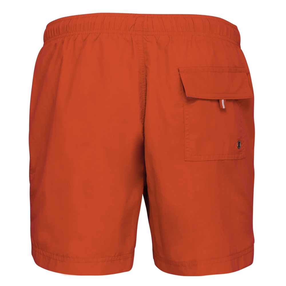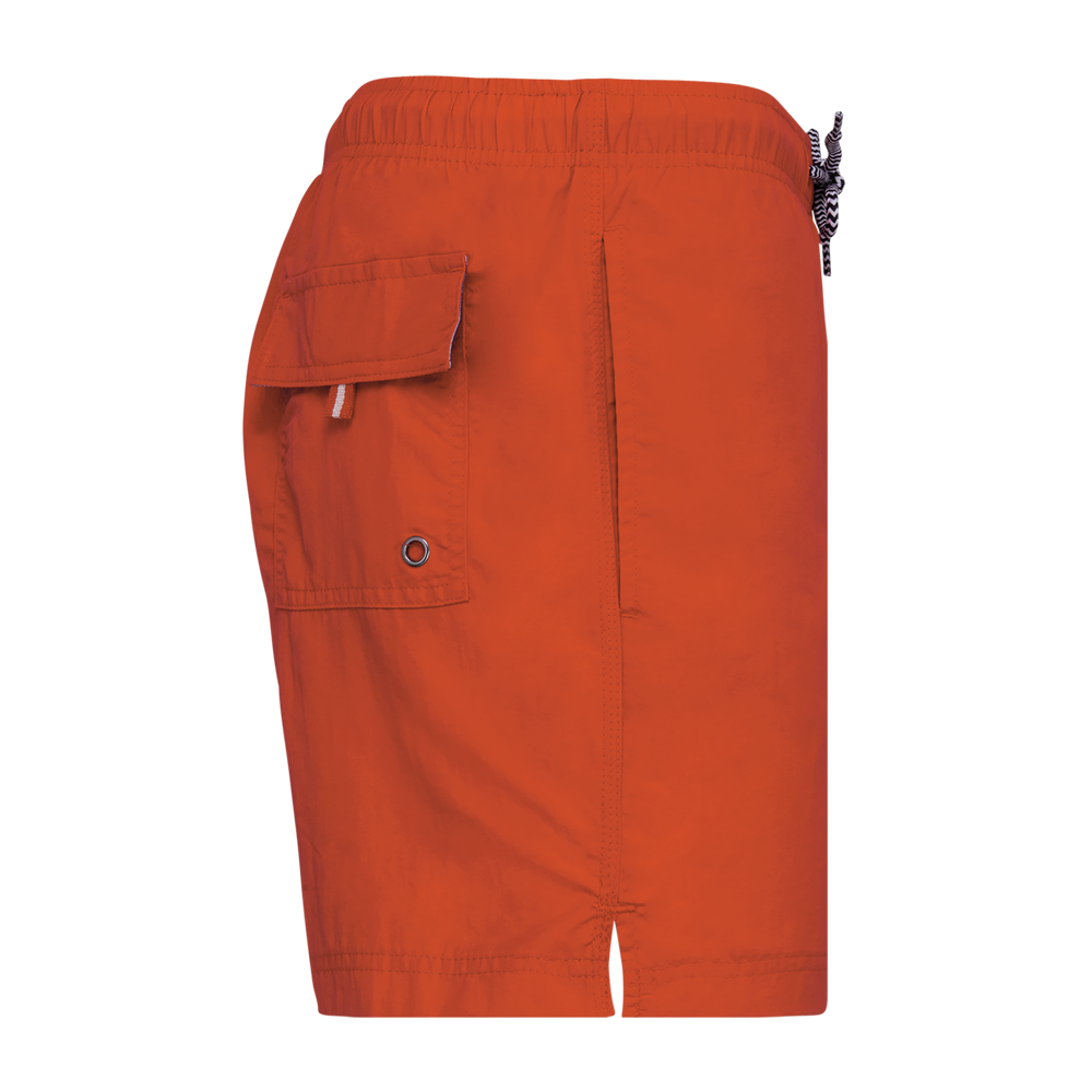 Esterno: 100% poliammide 105 g/m². Slip integrato in rete 100% poliestere 65 g/m². Fodera girovita in policotone 80 g/m². Tessuto leggero. Taglio alla moda. 2 tasche laterali e 1 tasca posteriore con occhielli, patta e velcro. Girovita interno fantasia elasticizzato con coulisse.
