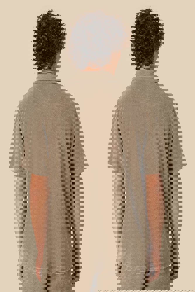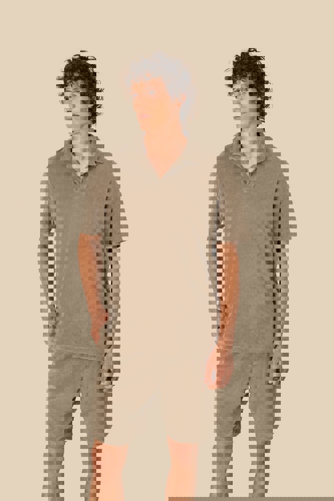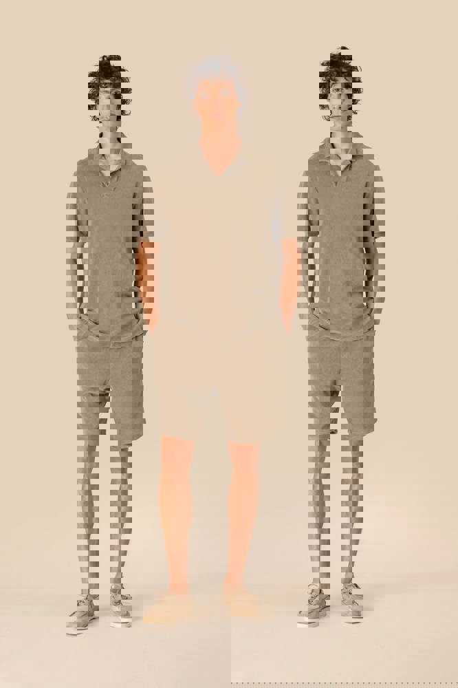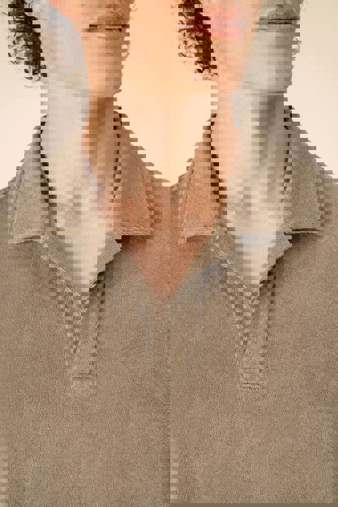 80% cotone biologico / 20% poliestere riciclato post-consumo. Capo fabbricato in Portogallo. Cotone pettinato. Spugna. Taglio dritto. Lavaggio agli enzimi. Collo e pattina polo a V senza bottoni nel tessuto principale. Rinforzi sulle spalle. Finitura a fondo manica e fondo capo a doppia impuntura. Mezzaluna sul retro.