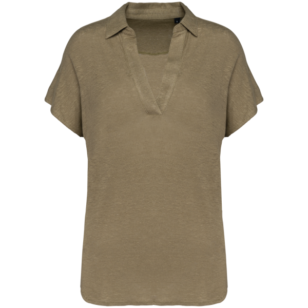 100% lino. Maglia. Taglio regolare con maniche a spalle cadenti. Spacchetti laterali con finitura a coda di rondine. Collo con interno collo e pattina senza bottoni polo a V nel tessuto principale. Doppia sovracucitura a fondo capo e fondo manica. Mezzaluna sul retro.