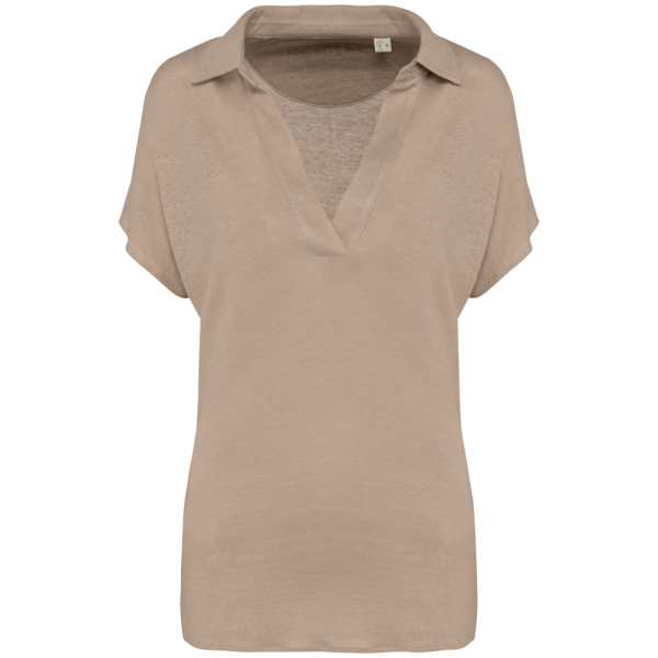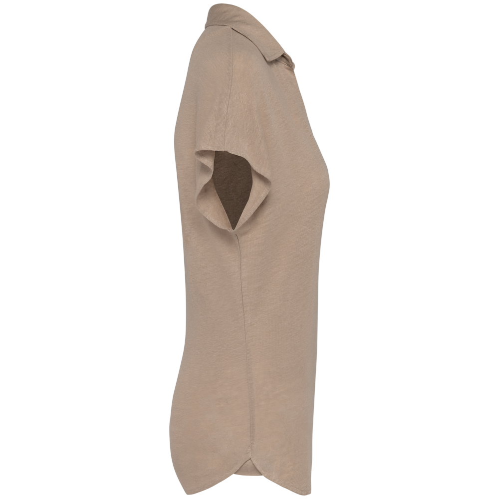 100% lino. Maglia. Taglio regolare con maniche a spalle cadenti. Spacchetti laterali con finitura a coda di rondine. Collo con interno collo e pattina senza bottoni polo a V nel tessuto principale. Doppia sovracucitura a fondo capo e fondo manica. Mezzaluna sul retro.