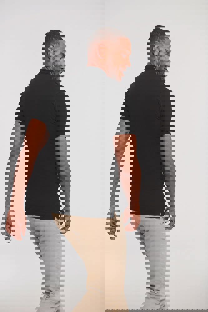 95% cotone / 5% Lycra®. Pattina con 3 bottoni a contrasto. Colletto e fondo manica a costine. Colletto con risvolto piccolo. Rinforzi sulle spalle. Spacchetti laterali con rinforzo a motivo spigato. Tessuto ultra morbido. Taglio slim.