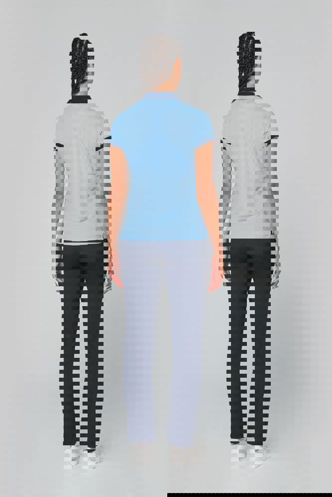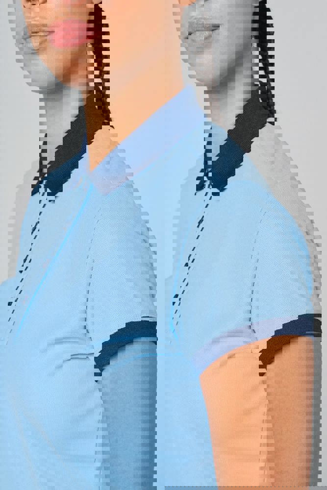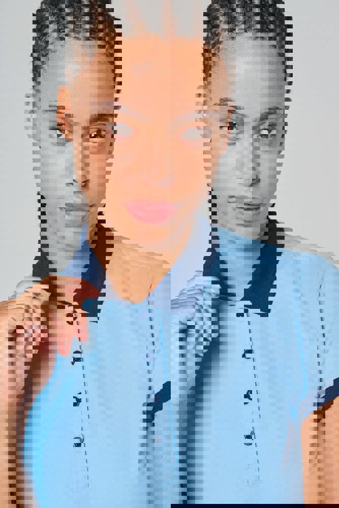 100% poliestere piqué Cool Plus®. Taglio sagomato e look moderno. Colletto e fondo manica a costine a contrasto. Pattina a 4 bottoni (a contrasto o tinta unita a seconda del modello). Spacchetti laterali.