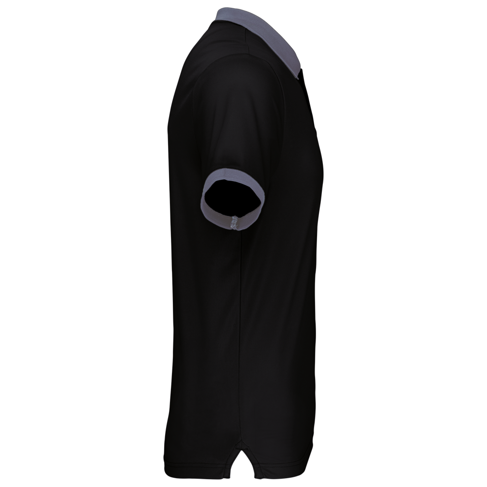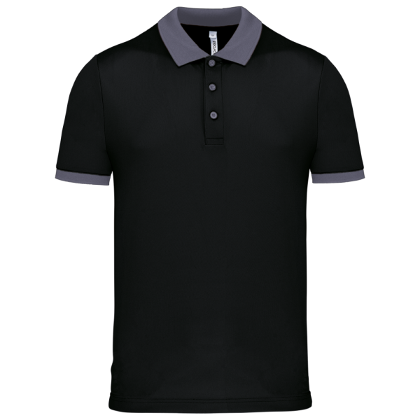 100% poliestere piqué Cool Plus®. Taglio dritto. Colletto e fondo manica a costine a contrasto. Pattina a 3 bottoni (a contrasto o tinta unita a seconda del modello). Spacchetti laterali.