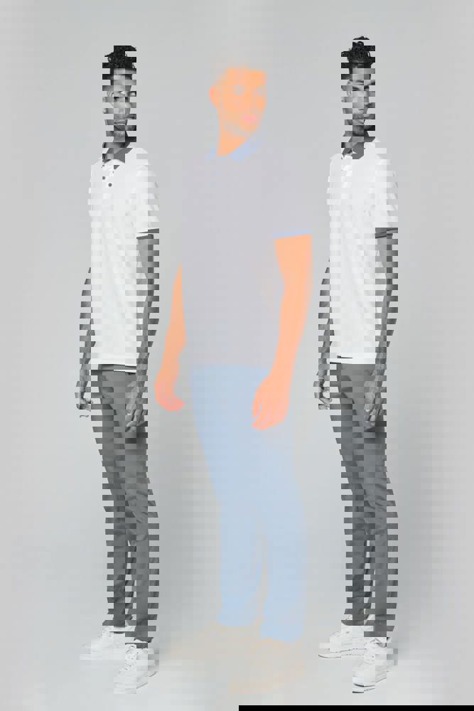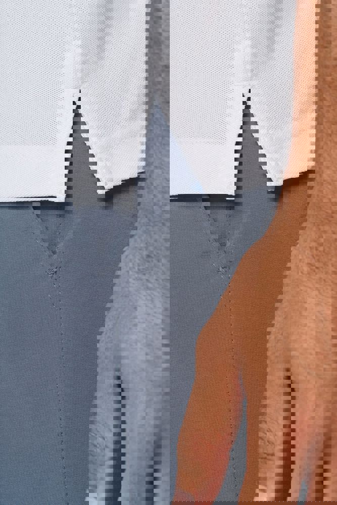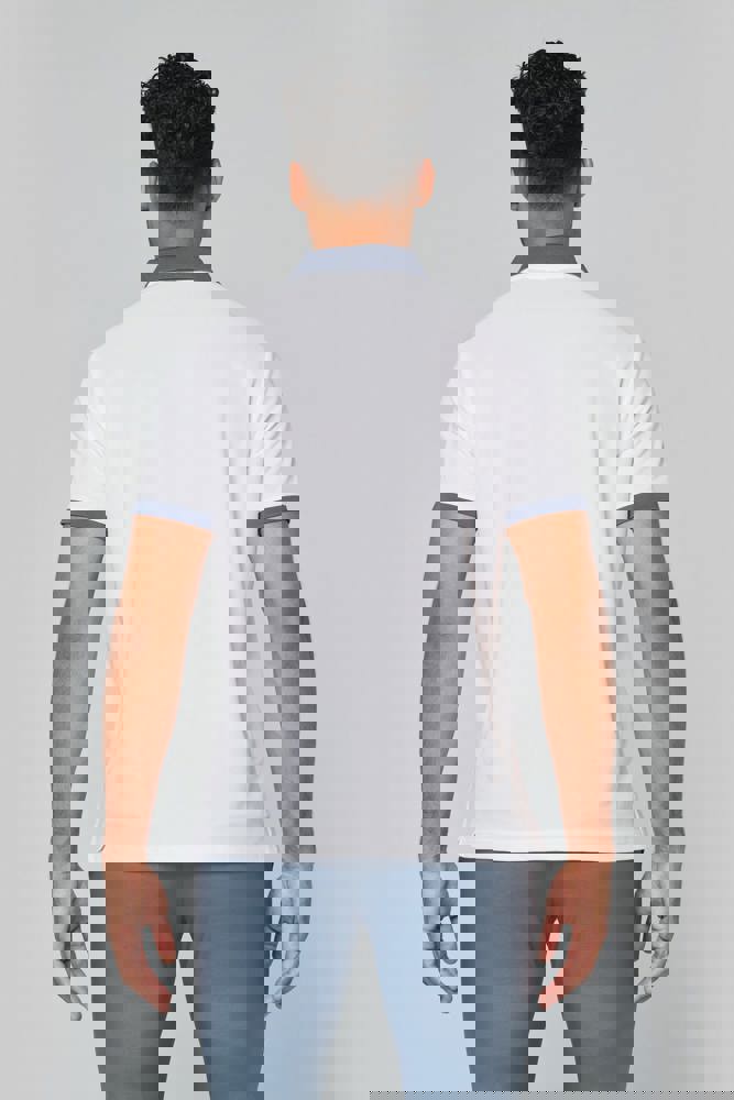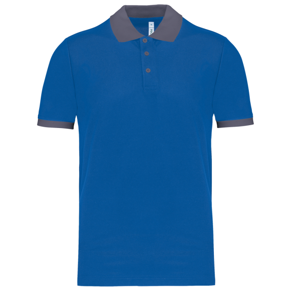 100% poliestere piqué Cool Plus®. Taglio dritto. Colletto e fondo manica a costine a contrasto. Pattina a 3 bottoni (a contrasto o tinta unita a seconda del modello). Spacchetti laterali.