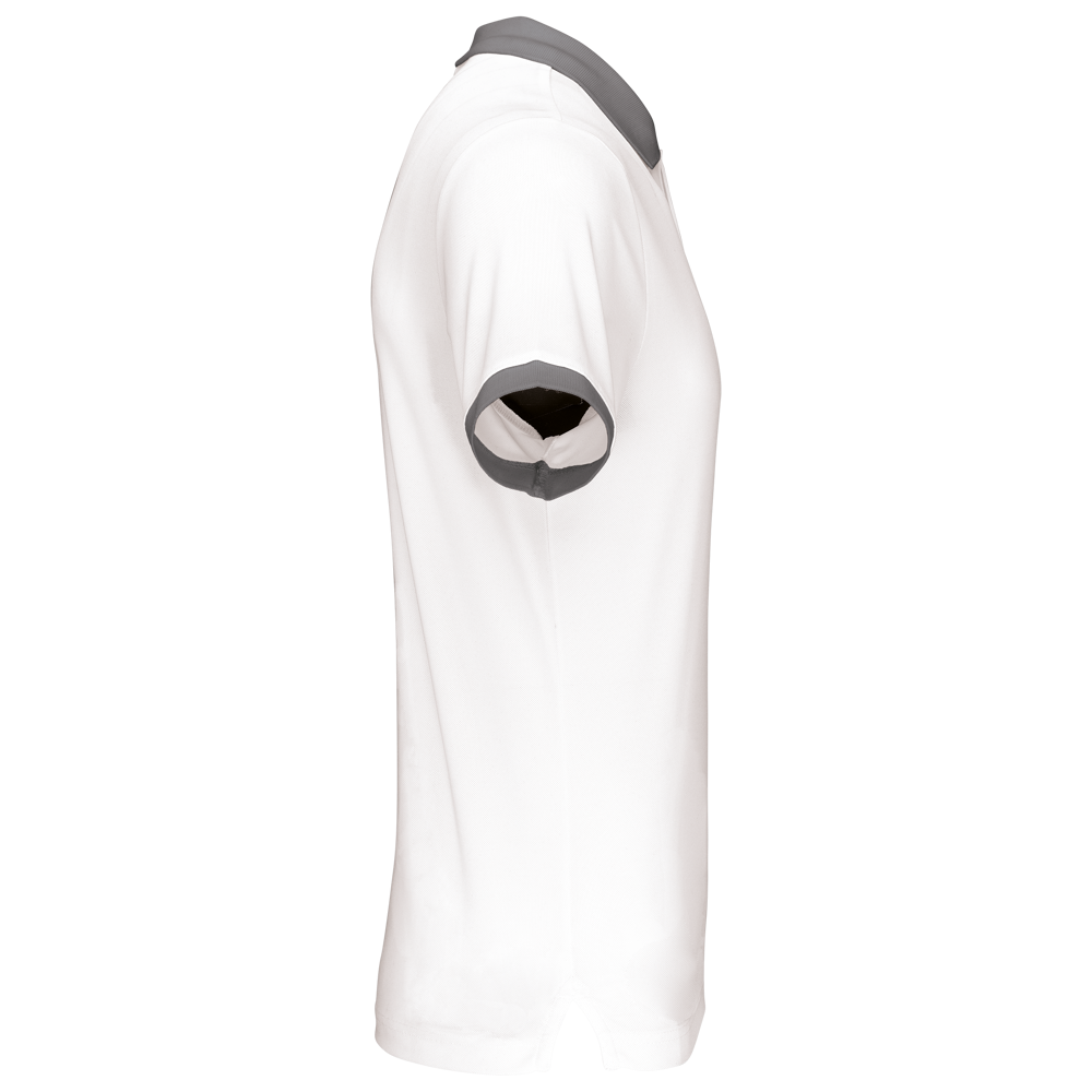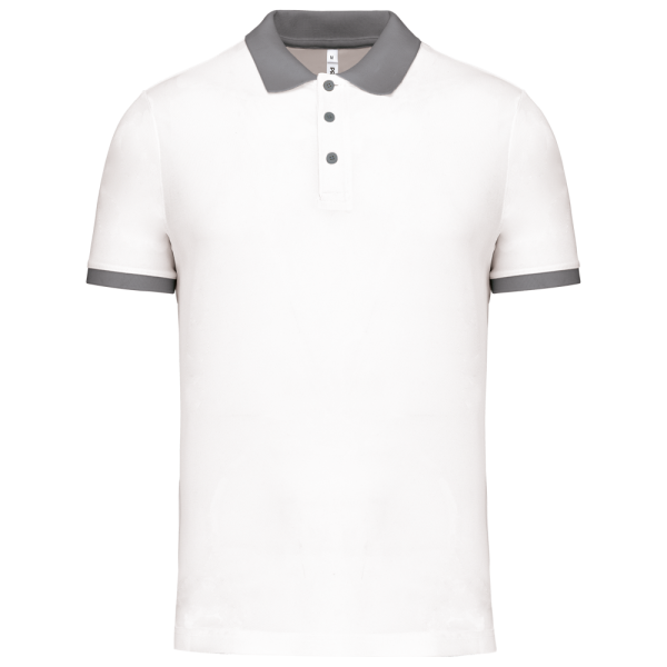 100% poliestere piqué Cool Plus®. Taglio dritto. Colletto e fondo manica a costine a contrasto. Pattina a 3 bottoni (a contrasto o tinta unita a seconda del modello). Spacchetti laterali.