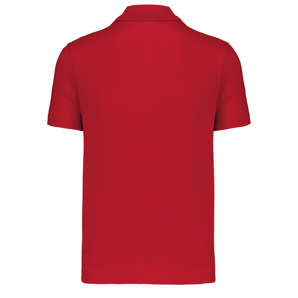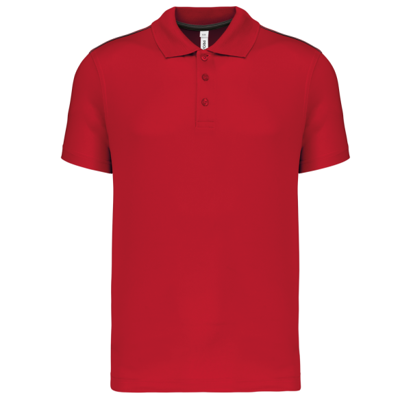100% poliestere interlock. Tessuto ad asciugatura rapida. Colletto a costine. Pattina a contrasto con 3 bottoni. Nastrino di rinforzo a contrasto sul collo e sugli spacchetti laterali. Dettaglio a contrasto sulle spalle. Finitura a doppio ago a fondo manica e fondo capo.