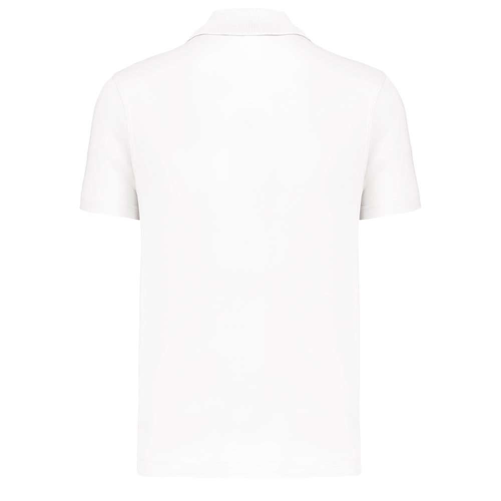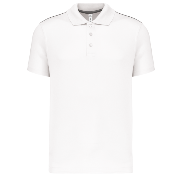 100% poliestere interlock. Tessuto ad asciugatura rapida. Colletto a costine. Pattina a contrasto con 3 bottoni. Nastrino di rinforzo a contrasto sul collo e sugli spacchetti laterali. Dettaglio a contrasto sulle spalle. Finitura a doppio ago a fondo manica e fondo capo.