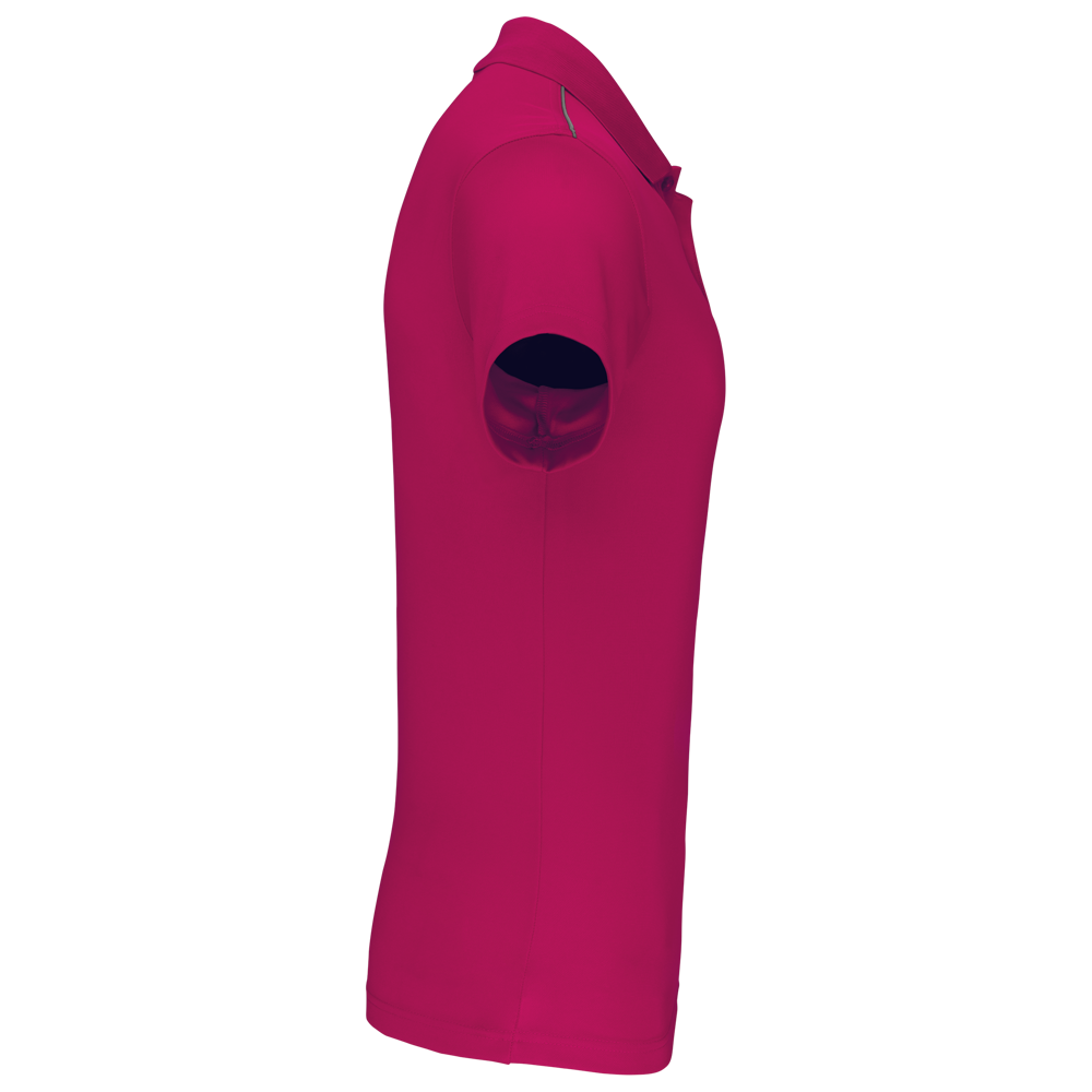 100% Poliestere Interlock Quick Dry ®. Collo in costina a 3 bottoni. Nastrino al collo in contrasto e spacchetti laterali. Piping in contrasto alle spalle. Cuciture a doppio ago alle maniche e sul fondo.