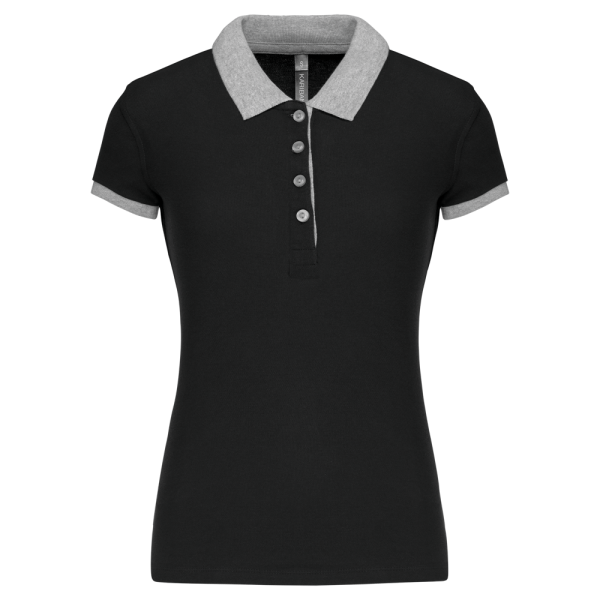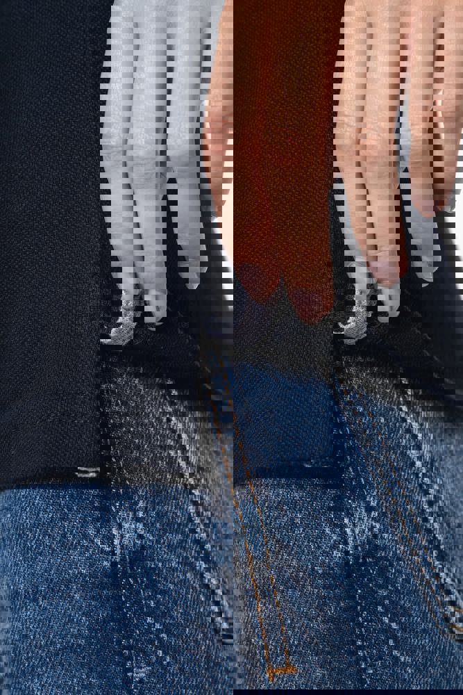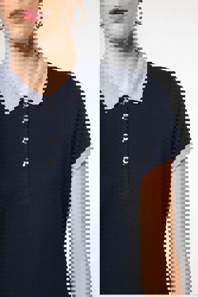 100% cotone piqué preristretto (Oxford Grey: 90% cotone / 10% viscosa). Collo e fondo manica a costine a contrasto. Nastrino di rinforzo nel collo e spacchetti laterali a contrasto. Pattina interna a contrasto con 4 bottoni. Finitura a doppia impuntura a fondo capo.