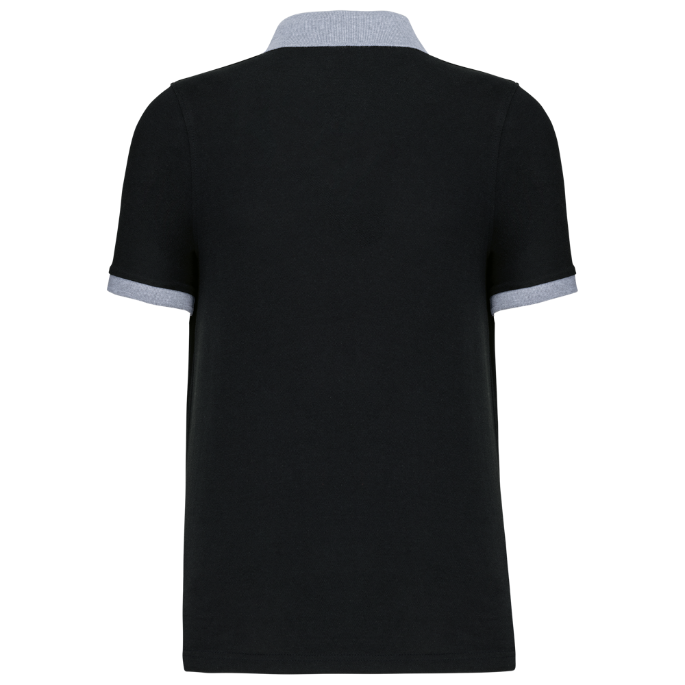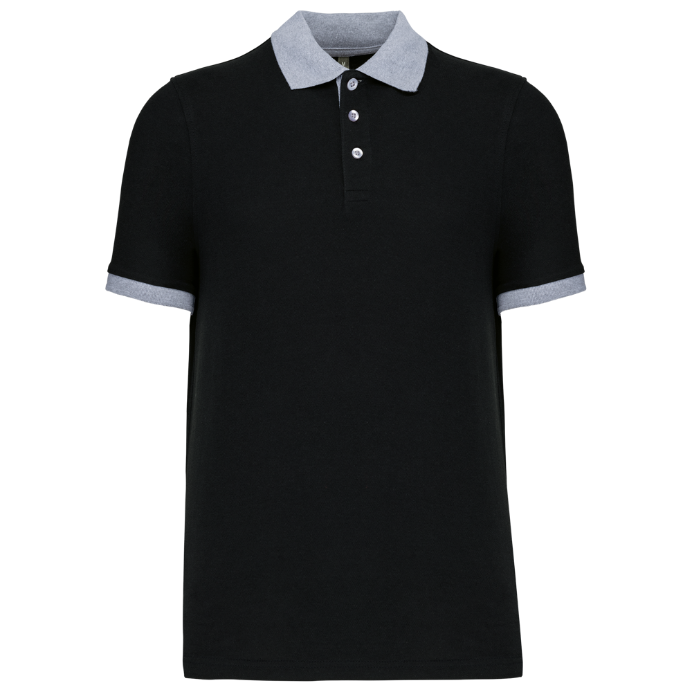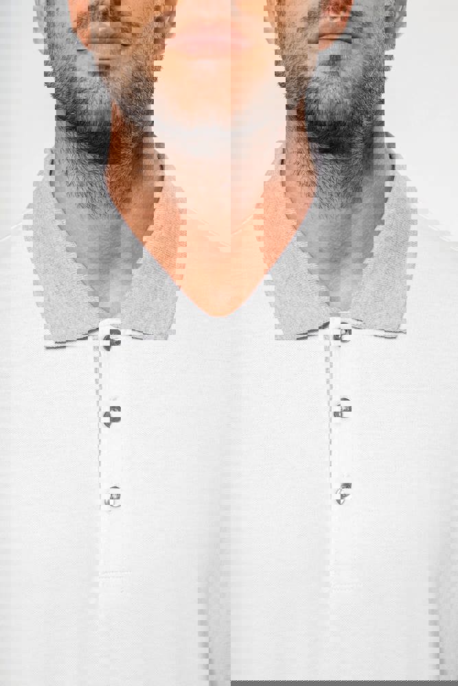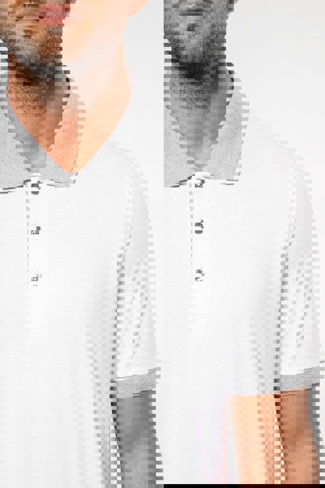100% cotone piqué preristretto (Oxford Grey: 90% cotone / 10% viscosa). Collo e fondo manica a costine a contrasto. Nastrino di rinforzo a contrasto sul collo. Pattina interna a contrasto con 3 bottoni. Finitura a doppia impuntura a fondo capo.