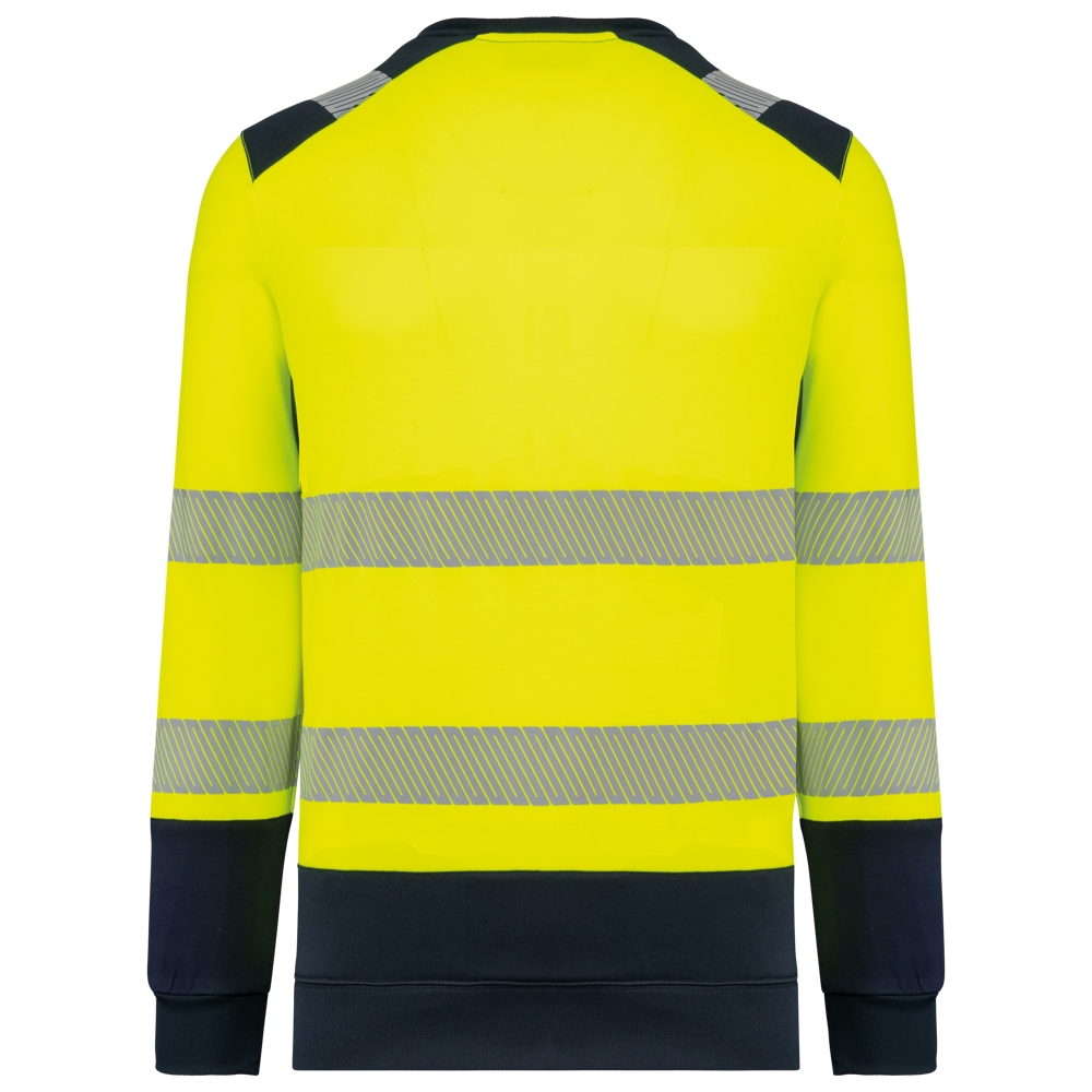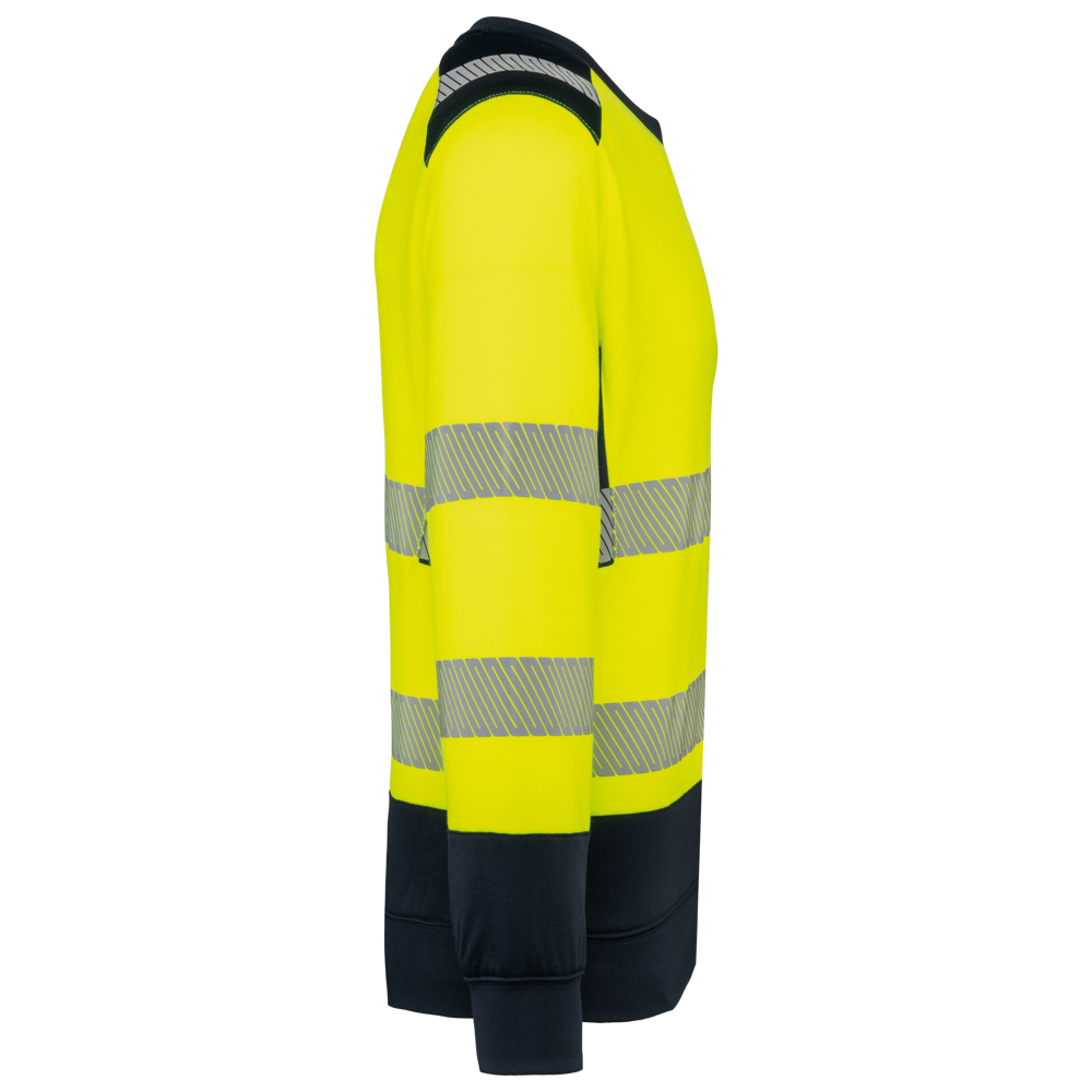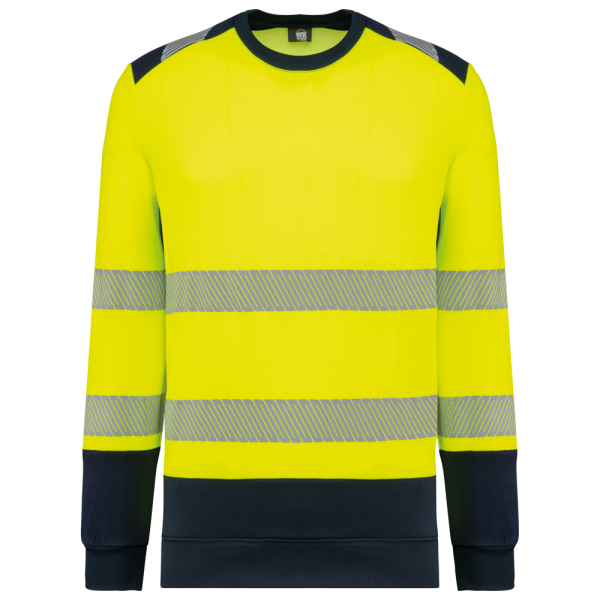 65% poliestere riciclato / 35% cotone. Cotone pettinato. Felpa garzata. Trattamento antipilling. Lavaggio a 60 °C (25 cicli). Taglio regolare. Inserti a contrasto sulle spalle con striscia segmentata riflettente di 5 cm. Collo a costine 1x1 foderato in 100% poliestere riciclato. Inserto a contrasto nel sottomanica. 2 strisce segmentate riflettenti di 5 cm sul davanti, dietro e sulle maniche. Fondo manica e fondo capo a contrasto. Finitura a contrasto a costine 1x1 in 100% poliestere riciclato a fondo manica e fondo capo. DPI Classe II. Norme UNI EN 13758-1+A1:2007 + UNI EN 13758-2+A1:2007: Protezione UPF40+ (Proprietà di protezione contro i raggi solari UV), UNI EN ISO 13688:2013 + UNI EN ISO 13688/A1:2021 (Indumenti protettivi - Requisiti generali), UNI EN ISO 20471:2013 + UNI EN ISO 20471/A1:2017: Classe 2 (Indumenti ad alta visibilità - Metodi di prova e requisiti), RIS-3279-TOM Edizione 2:2019 solo per il colore Hi Viz Orange/Navy (Standard del settore ferroviario). Etichetta con il nome della marca rimovibile.