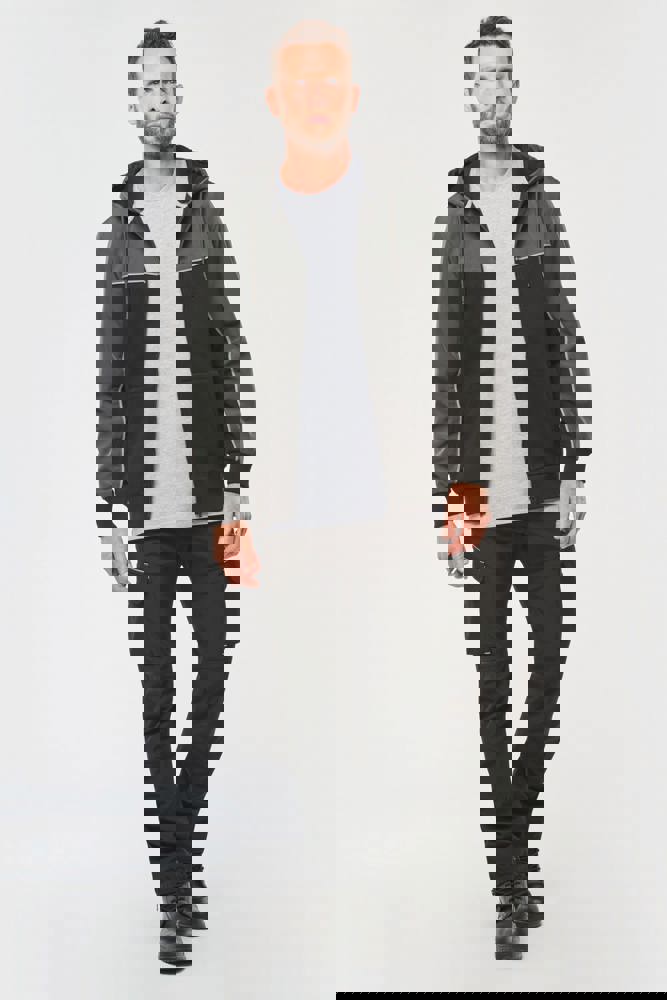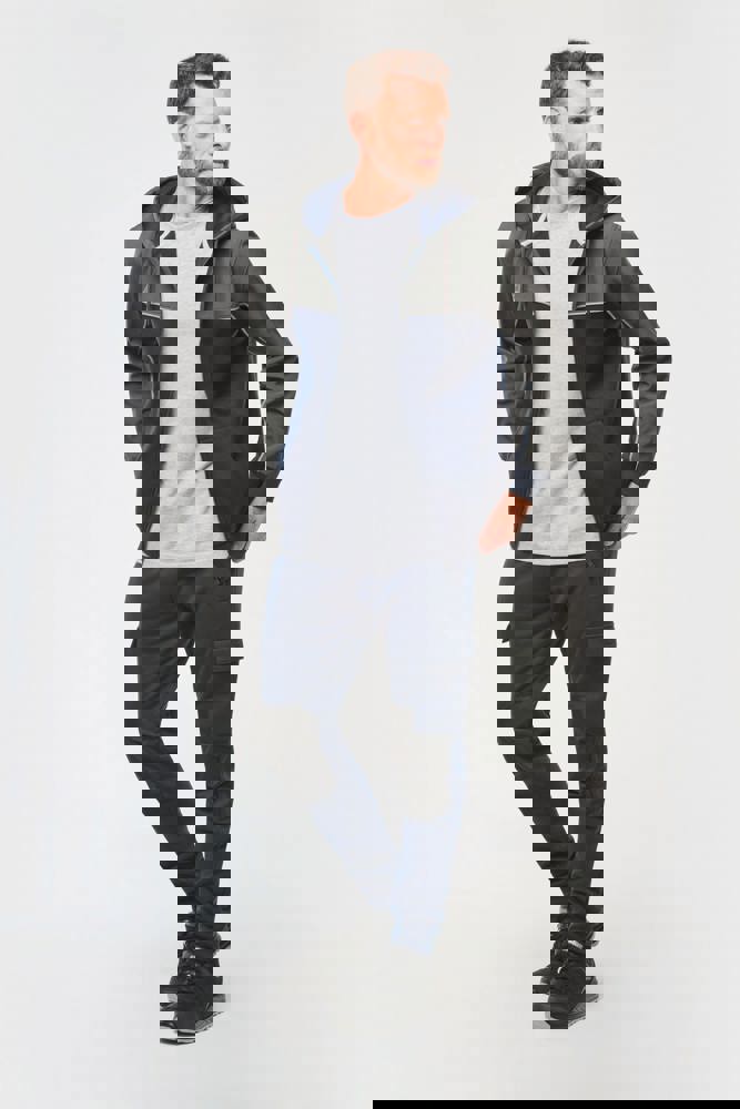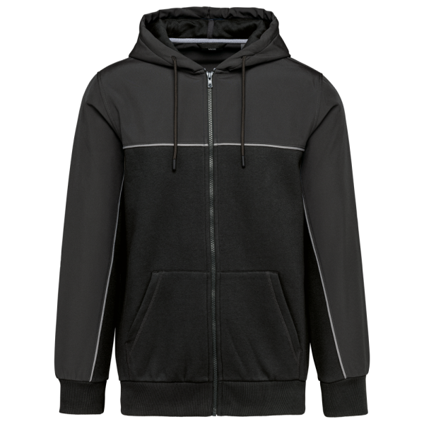 60% cotone / 40% poliestere riciclato. Tessuto degli inserti: softshell a 2 strati idrorepellente 95% poliestere / 5% elastan. Taglio dritto. 2 tasche a canguro. Cappuccio a 2 pannelli con coulisse rotonda e puntali in gomma. Inserti davanti, dietro e nella parte alta delle maniche in tessuto a contrasto. Chiusura anteriore a zip tono su tono. Mezzaluna sul retro in softshell. Dettaglio a contrasto Silver negli inserti anteriori e sulle maniche. Asola per appendere il capo e nastrino di rinforzo a motivo spigato Silver nel collo. Fondo manica e fondo capo a costine 2x2 con struttura tubolare. Etichetta con il nome del marchio rimovibile.