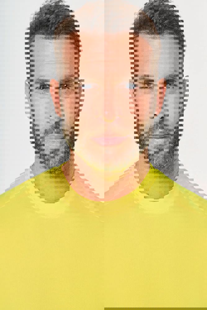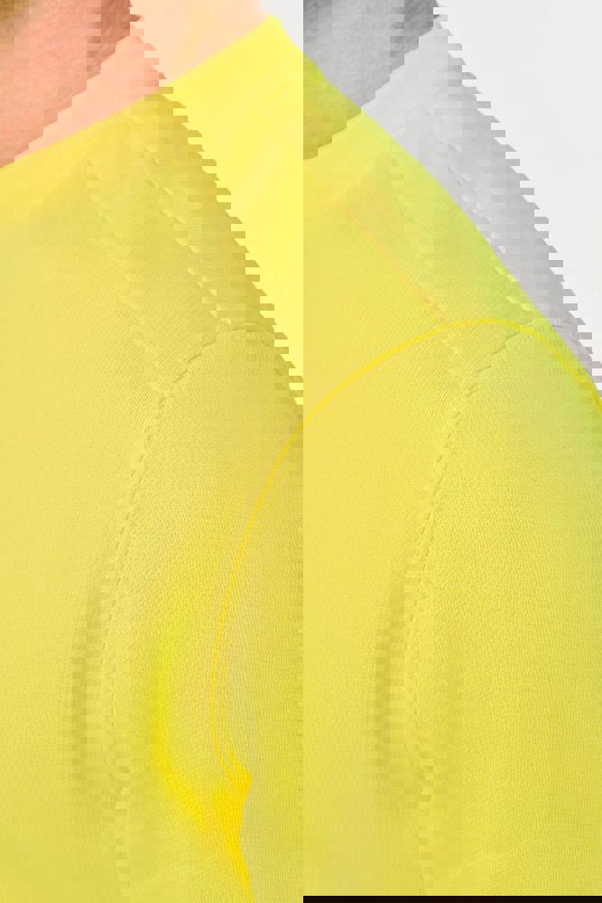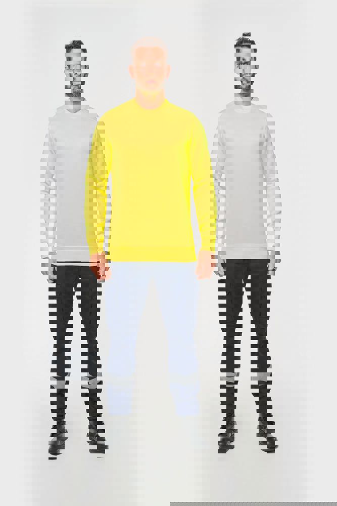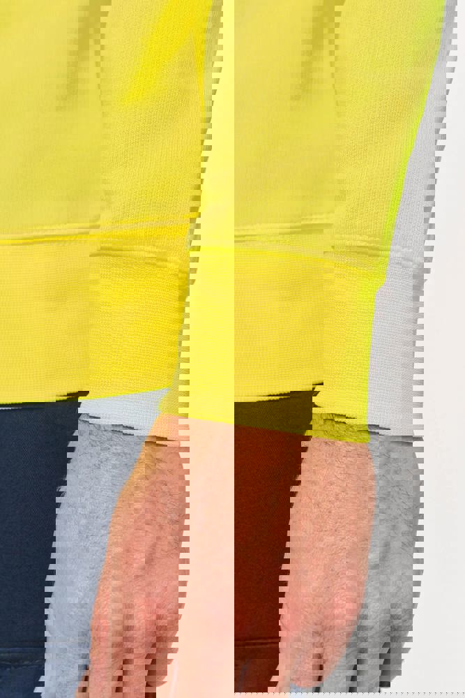 77% poliestere riciclato / 23% cotone pettinato. Felpa garzata LSF a 3 fili (Low Shrinkage Fleece). Taglio regolare. Lavaggio industriale (10 lavaggi). Asciugatura in tunnel. Collo, fondo capo e fondo manica a costine 1x1. Nastrino di rinforzo sul collo. Rinforzi interni sulle spalle in tessuto pettinato 65% poliestere/35% cotone per evitare che il capo si deformi durante il lavaggio e l'asciugatura in tunnel. Taschina RFID a fondo capo sotto l'etichetta. EPI Classe II - Norme NF EN ISO 13688:2013 + NF EN ISO 13688/A1:2021 (Indumenti di protezione - Requisiti generali), NF EN 17353:2020: Tipo A (Indumenti di protezione - Dispositivi di visibilità migliorata per situazioni a rischio moderato - Metodi di prova e requisiti), NF EN ISO 15797:2018 (Tessuti - Metodi di lavaggio e finitura industriale per i test sugli indumenti da lavoro): Lavaggio industriale professionale - Metodo di lavaggio programma 8 con finitura esclusivamente in tunnel. Etichetta del marchio tessuta.