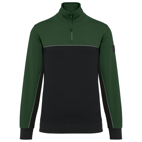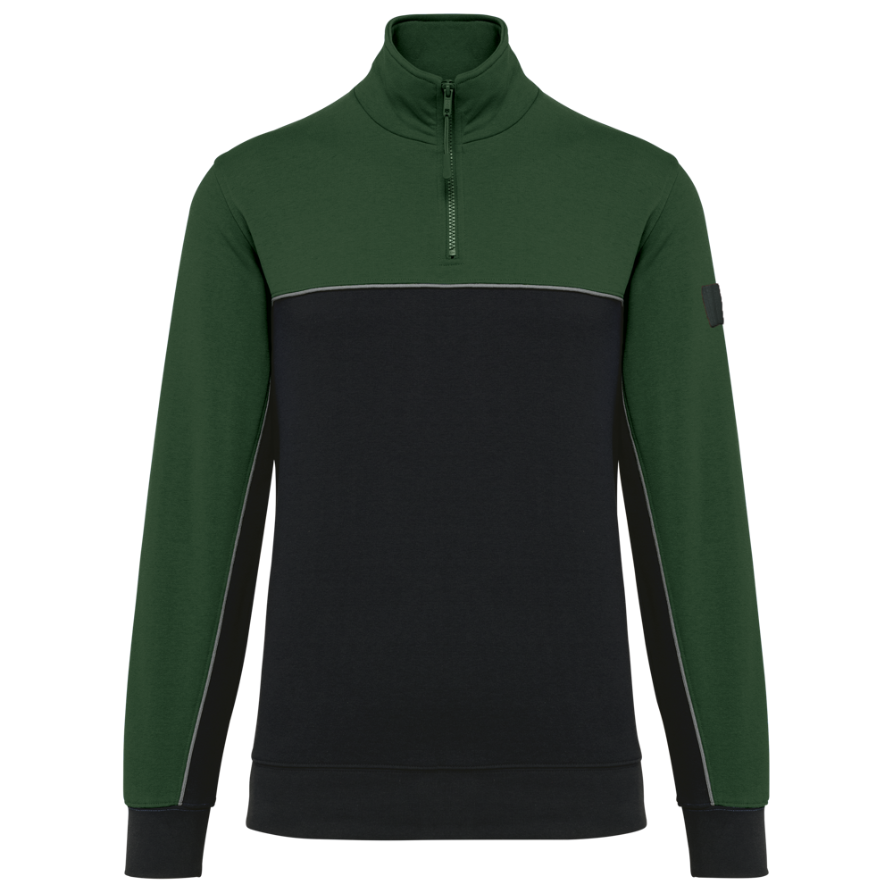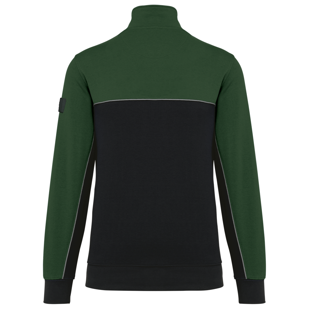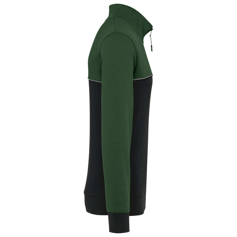 60% cotone / 40% Poliestere riciclato. Tessuto felpato 3 fili LSF (Low Shrinkage Fleece). Taglio dritto. Maniche a giro. Collo con zip in plastica e cursore tono su tono riciclato. Nastrino di rinforzo a contrasto con motivo spigato. Finitura a mezzaluna nella parte posteriore del collo che facilita la personalizzazione della marca all'interno. Dettaglio a contrasto tra le parti bicolore del capo (corpo e maniche davanti e dietro). Fondo manica e fondo capo a costine 1x1. Porta penna elasticizzato a 3 scomparti sulla manica sinistra. Etichetta con il nome del marchio staccabile.