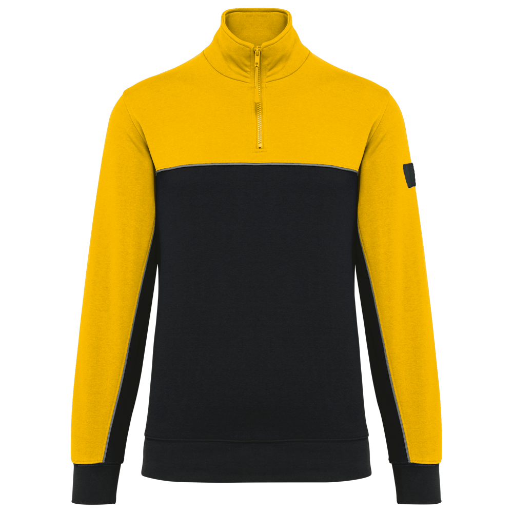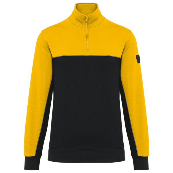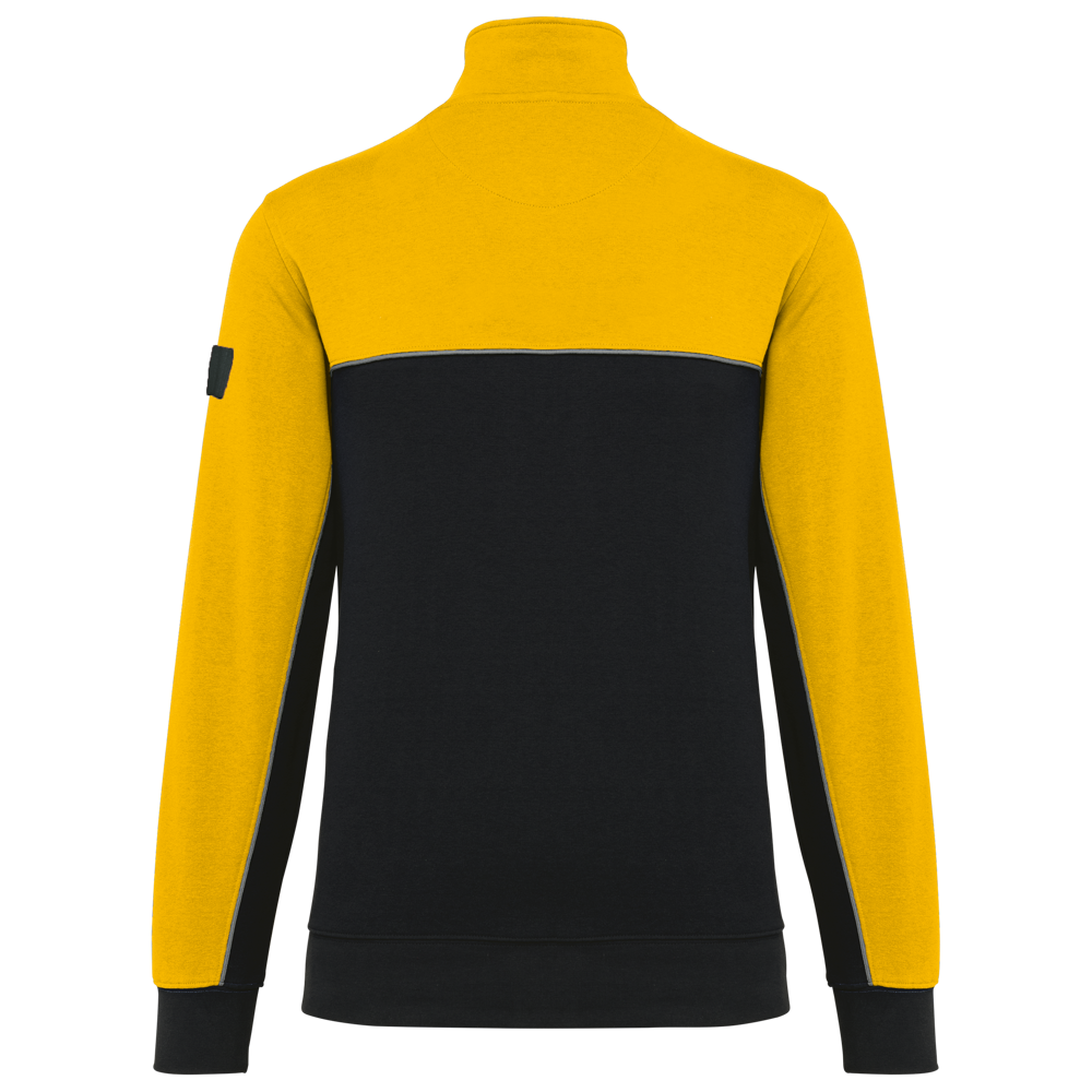 60% cotone / 40% Poliestere riciclato. Tessuto felpato 3 fili LSF (Low Shrinkage Fleece). Taglio dritto. Maniche a giro. Collo con zip in plastica e cursore tono su tono riciclato. Nastrino di rinforzo a contrasto con motivo spigato. Finitura a mezzaluna nella parte posteriore del collo che facilita la personalizzazione della marca all'interno. Dettaglio a contrasto tra le parti bicolore del capo (corpo e maniche davanti e dietro). Fondo manica e fondo capo a costine 1x1. Porta penna elasticizzato a 3 scomparti sulla manica sinistra. Etichetta con il nome del marchio staccabile.
