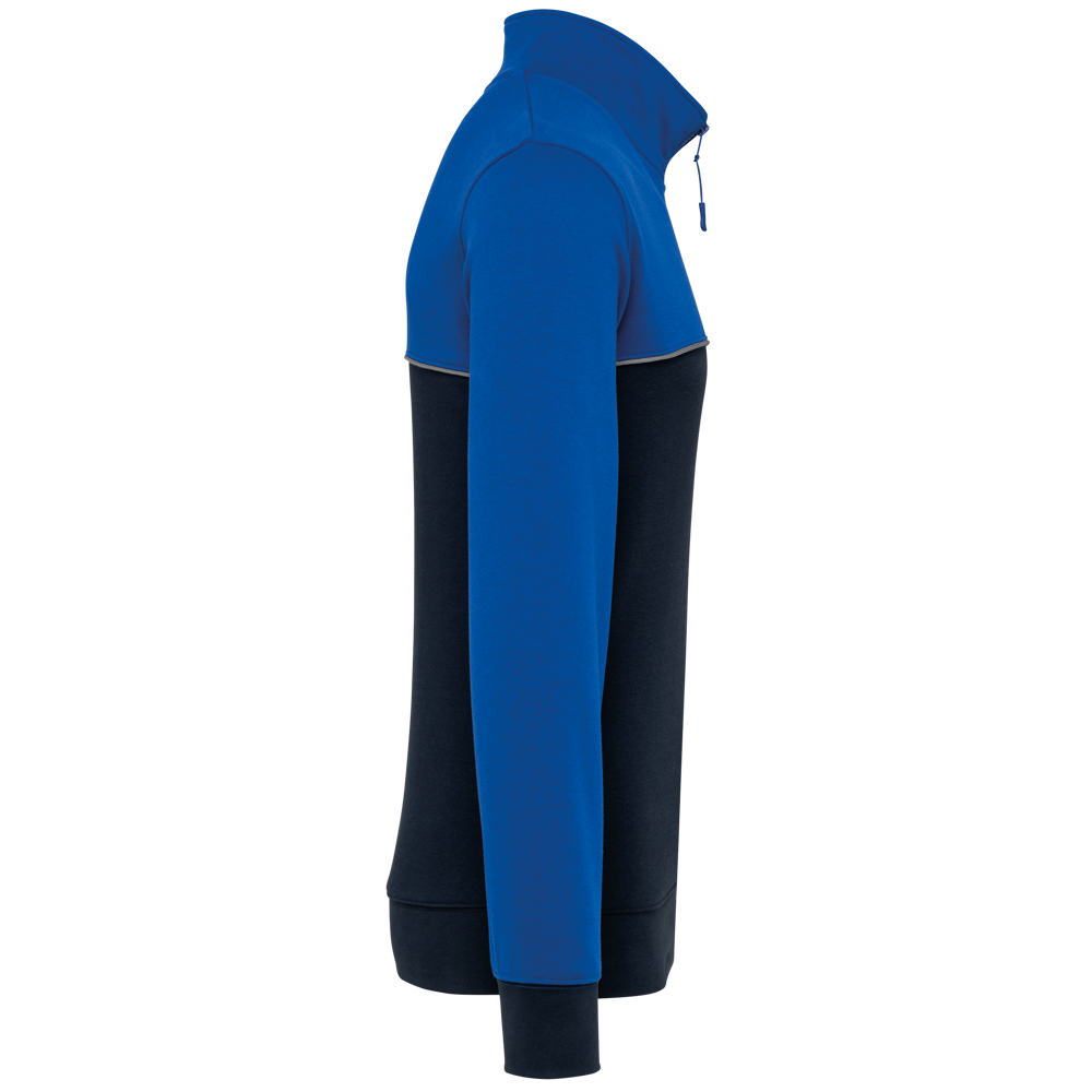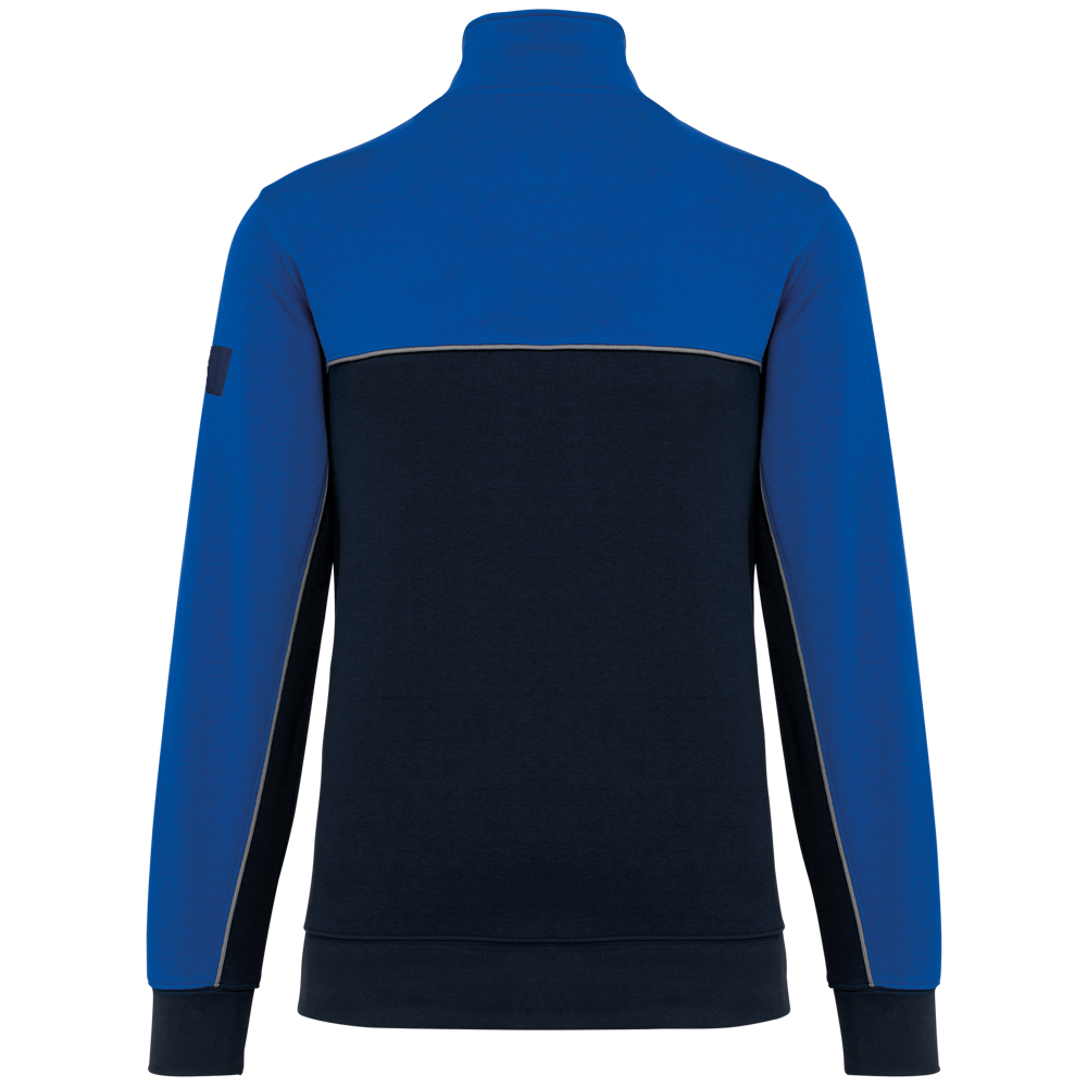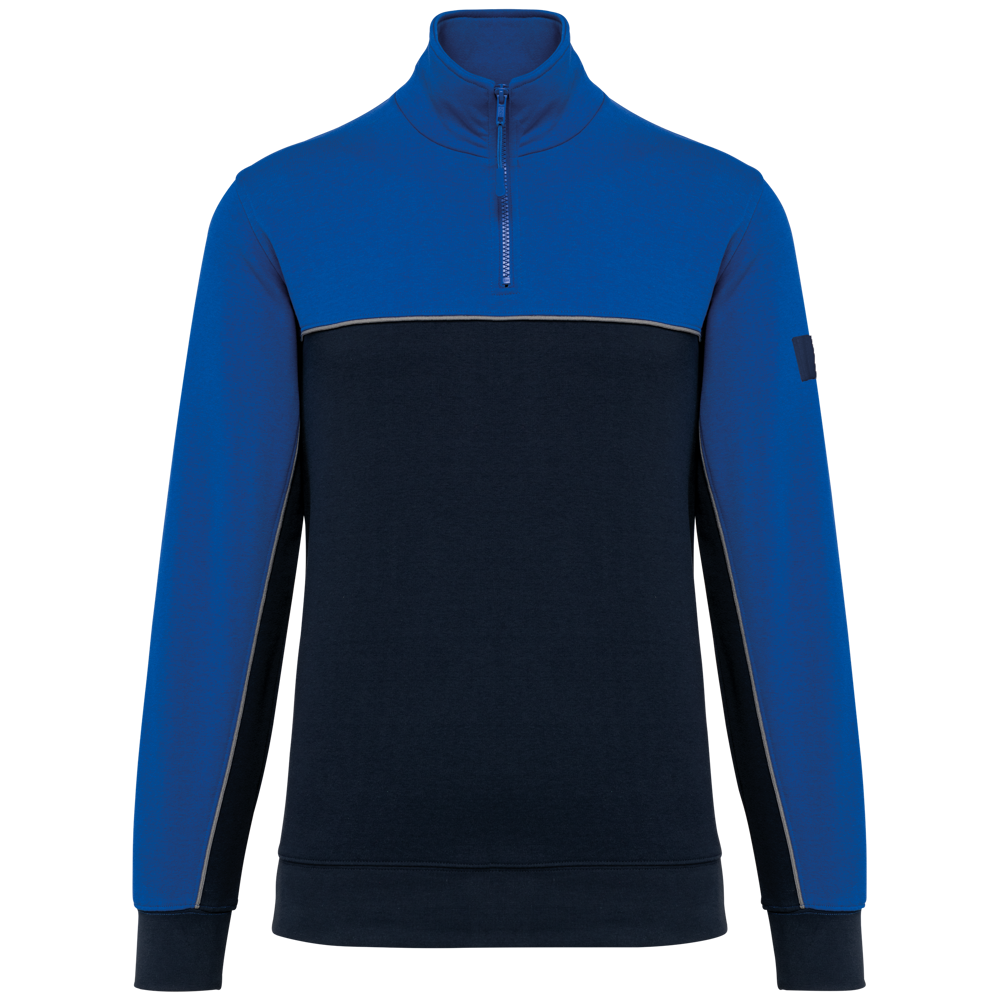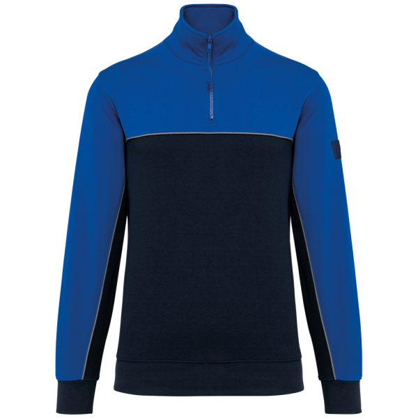 60% cotone / 40% Poliestere riciclato. Tessuto felpato 3 fili LSF (Low Shrinkage Fleece). Taglio dritto. Maniche a giro. Collo con zip in plastica e cursore tono su tono riciclato. Nastrino di rinforzo a contrasto con motivo spigato. Finitura a mezzaluna nella parte posteriore del collo che facilita la personalizzazione della marca all'interno. Dettaglio a contrasto tra le parti bicolore del capo (corpo e maniche davanti e dietro). Fondo manica e fondo capo a costine 1x1. Porta penna elasticizzato a 3 scomparti sulla manica sinistra. Etichetta con il nome del marchio staccabile.