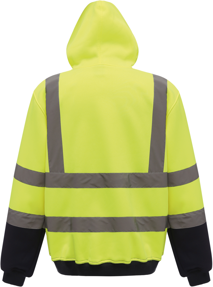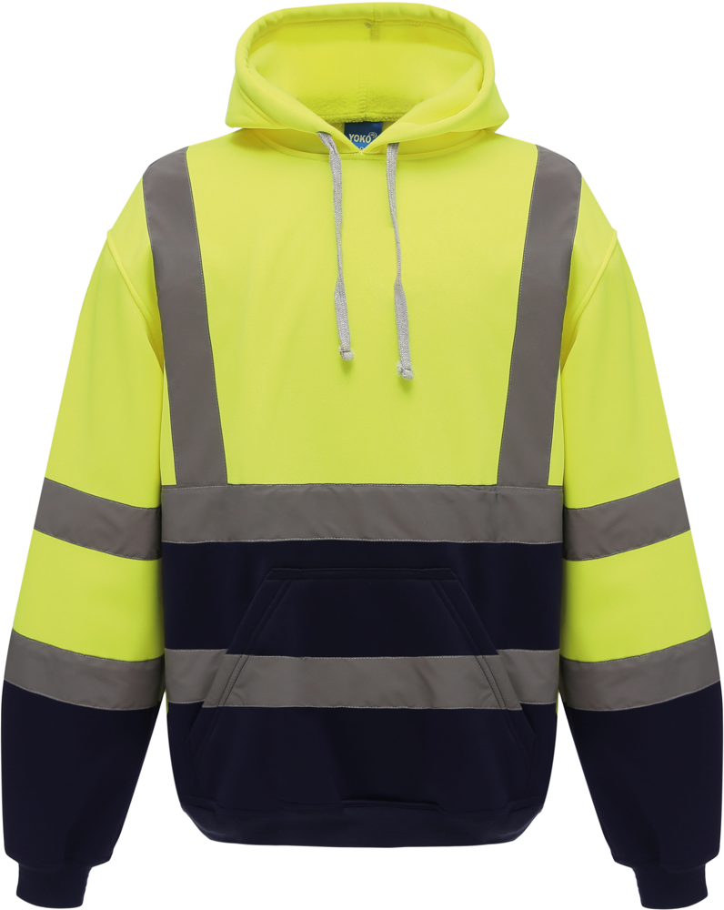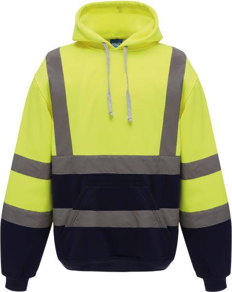 100% poliestere anti-pilling. 2 fasce riflettenti (larghezza 5 cm) intorno al corpo e alle braccia. Una "bretella" riflettente su ogni spalla. Nastrino di rinforzo sul collo. Cappuccio integrato (nel prolungamento del collo) con coulisse. Maniche a giro. Tasca a canguro sul davanti. Fondo manica e fondo capo a costine. Finitura a doppia impuntura sul collo, a fondo manica e fondo capo. Norma EN ISO 20471 Classe 3 : Hi-Vis Yellow, Hi-Vis Orange, Hi-Vis yellow/Navy, Hi-Vis Orange/Navy.