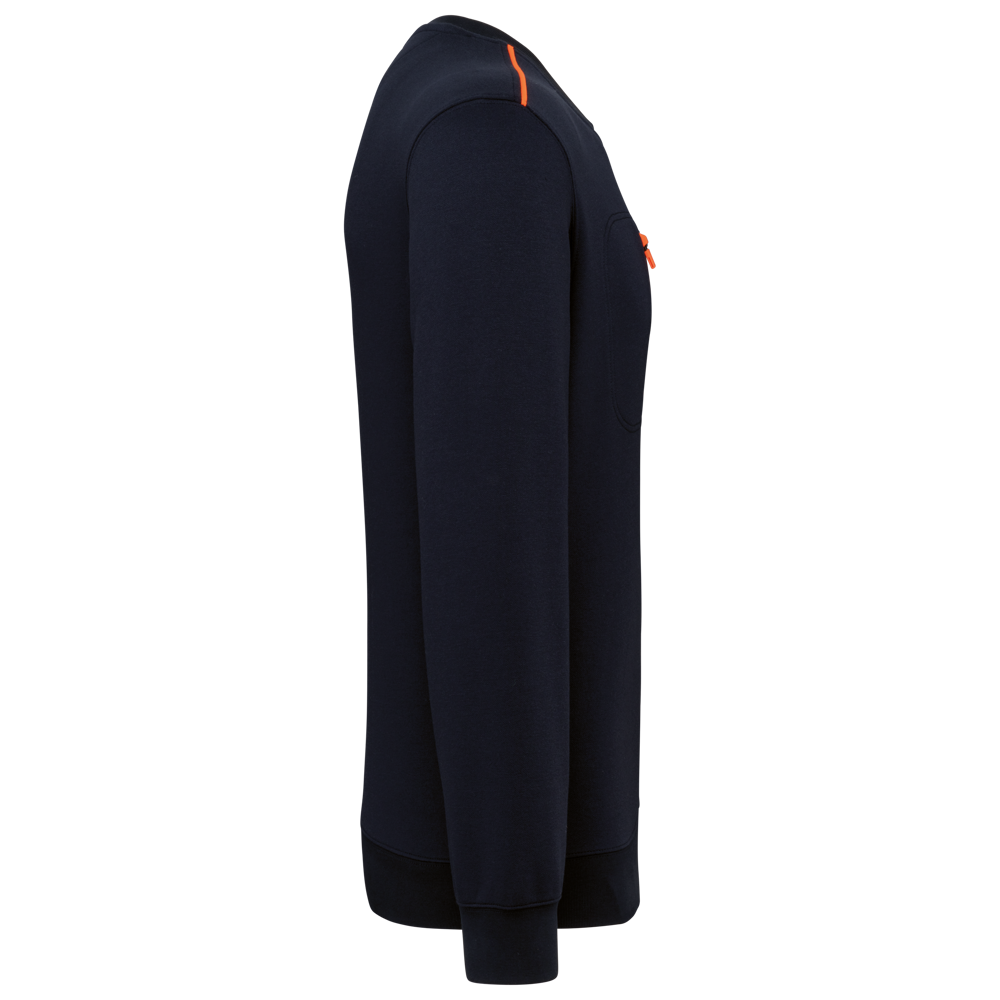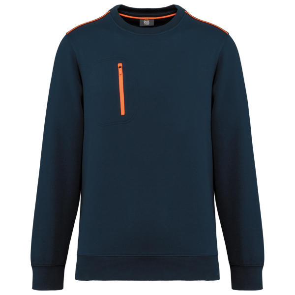 70% poliestere / 30% cotone. Cotone pettinato. Tessuto felpato LSF (Low Shrinkage Fleece) 3 fili. Filato Vortex. Lavabile a 60°C. Taglio dritto. Collo tondo con costine 1x1 e nastrino di rinforzo tono su tono con dettaglio a contrasto. Finitura a mezzaluna nella parte posteriore del collo che facilita la personalizzazione della marca all'interno. Dettaglio a contrasto sulle spalle. Taschino sul petto lato destro con zip a contrasto in nylon e cursore a contrasto. Finitura a doppia impuntura tono su tono sul bordo della tasca. Etichetta con il nome del marchio staccabile.