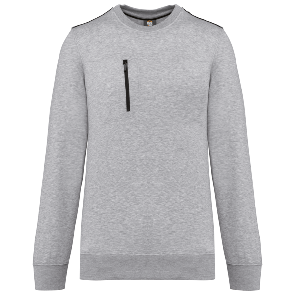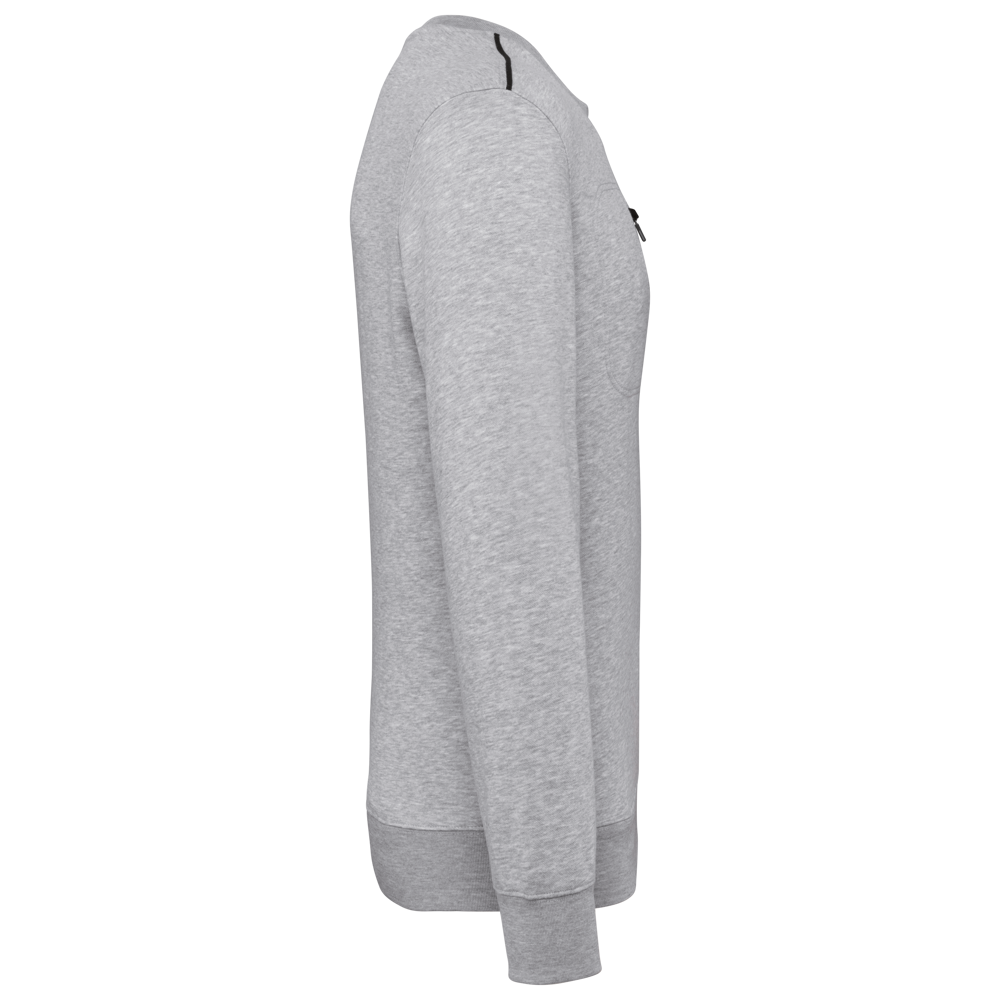 70% poliestere / 30% cotone. Cotone pettinato. Tessuto felpato LSF (Low Shrinkage Fleece) 3 fili. Filato Vortex. Lavabile a 60°C. Taglio dritto. Collo tondo con costine 1x1 e nastrino di rinforzo tono su tono con dettaglio a contrasto. Finitura a mezzaluna nella parte posteriore del collo che facilita la personalizzazione della marca all'interno. Dettaglio a contrasto sulle spalle. Taschino sul petto lato destro con zip a contrasto in nylon e cursore a contrasto. Finitura a doppia impuntura tono su tono sul bordo della tasca. Etichetta con il nome del marchio staccabile.