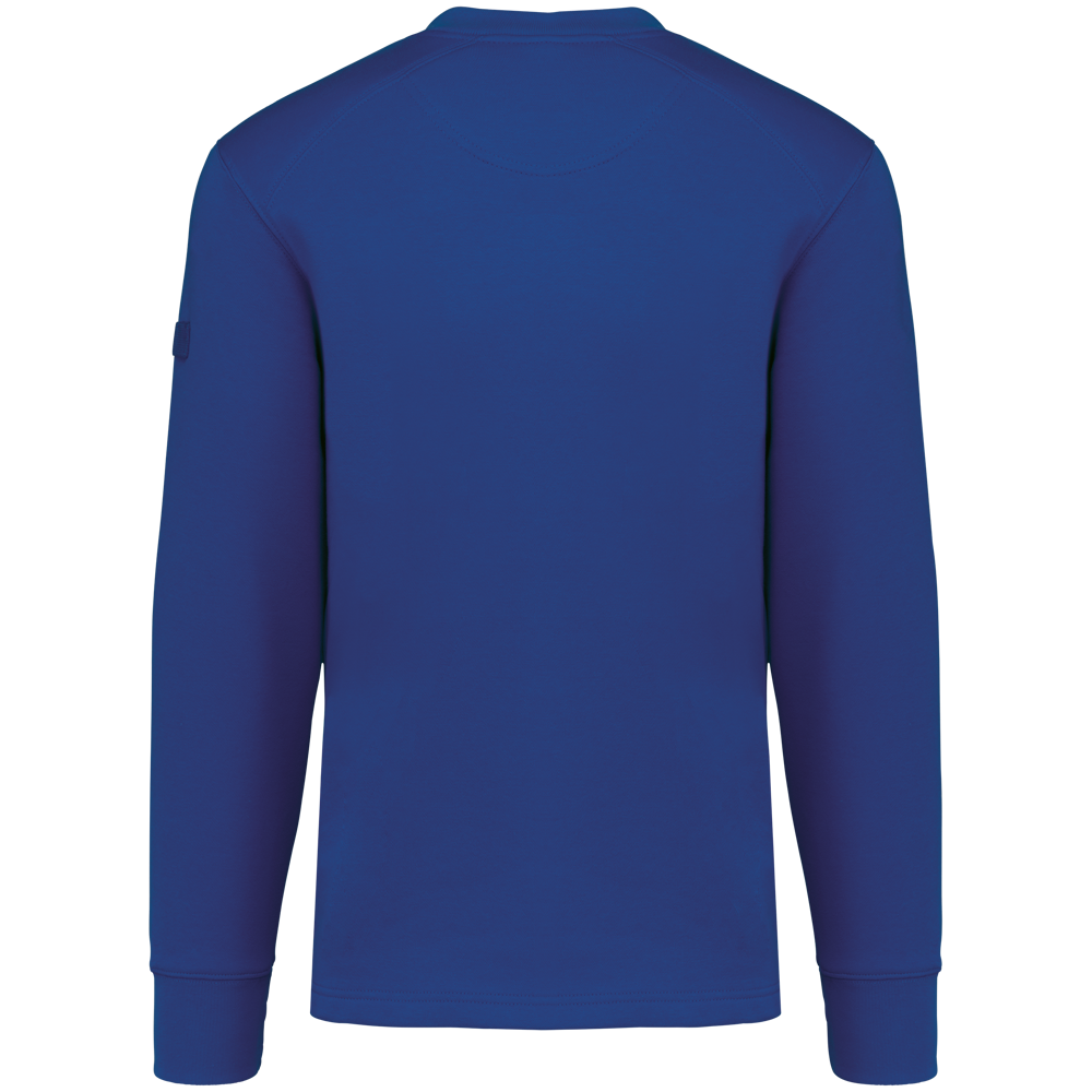 80% cotone / 20% poliestere. Tessuto felpato a 3 fili con trattamento LSF (Low Shrinkage Fleece). Lavabile a 60 °C. Colletto a polo e fondo manica a costine. Tasca con zip invisibile lato destro. Rinforzi su spalle e gomiti per una maggiore resistenza. Porta penna sulla manica sinistra. Finitura a mezzaluna sul dorso. Asola per appendere il capo cucita al collo. Finitura a doppia impuntura a fondo capo e parte posteriore più lunga per un maggior comfort.
