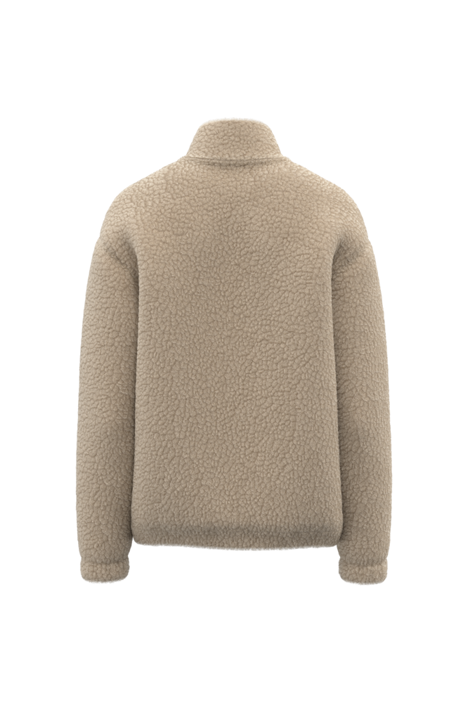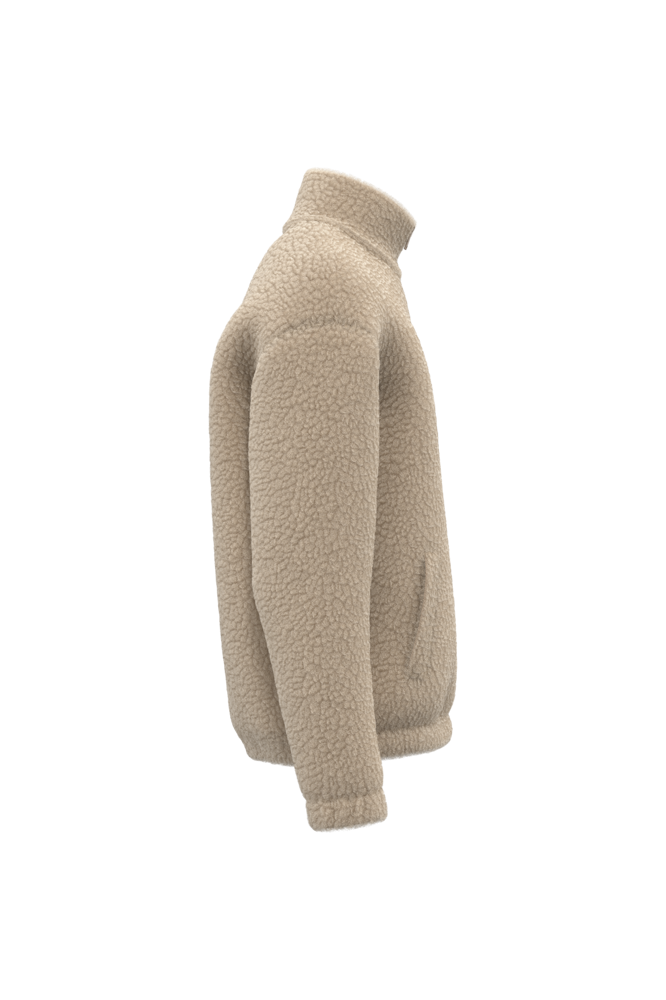 100% poliestere. Taglio regolare con spalle spioventi. Tessuto in sherpa con fodera principale in jersey e fodera delle maniche in taffetà per indossare facilmente il capo. Collo alto foderato nel tessuto principale. Finitura all'interno del collo con nastrino di rinforzo a motivo spigato tono su tono. Zip in plastica con cursore in metallo tono su tono. Fondo manica e fondo capo elastici. Due tasche a filetto sul davanti. Zip interna per la personalizzazione a fondo capo.