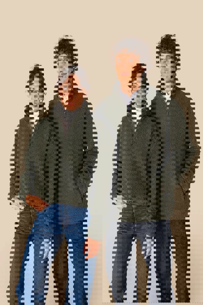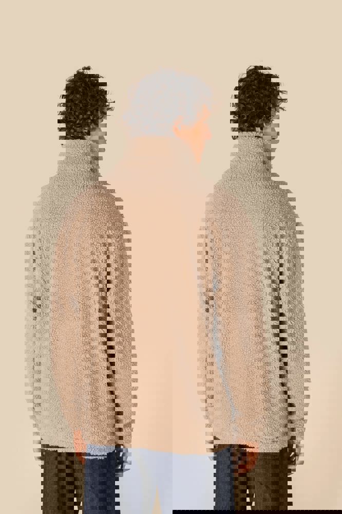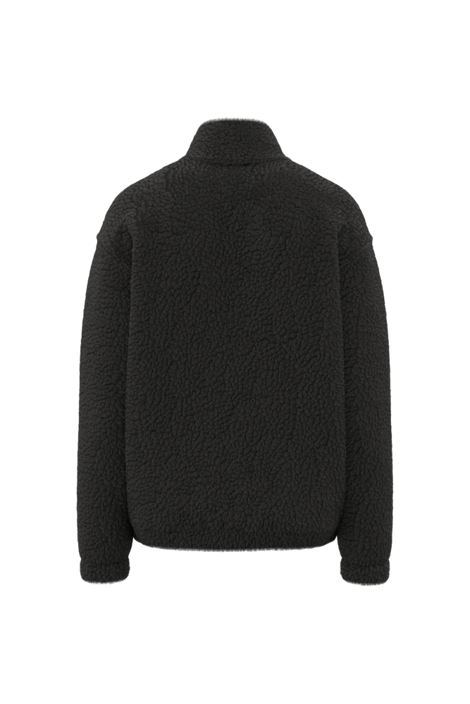 100% poliestere. Taglio regolare con spalle spioventi. Tessuto in sherpa con fodera principale in jersey e fodera delle maniche in taffetà per indossare facilmente il capo. Collo alto foderato nel tessuto principale con apertura con zip e cursore in metallo tono su tono. Finitura all'interno del collo con nastrino di rinforzo a motivo spigato tono su tono. Fondo manica e fondo capo elastici. Due tasche a filetto sul davanti. Zip interna per la personalizzazione a fondo capo.