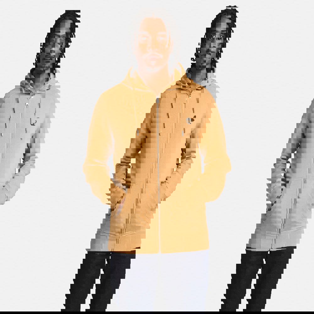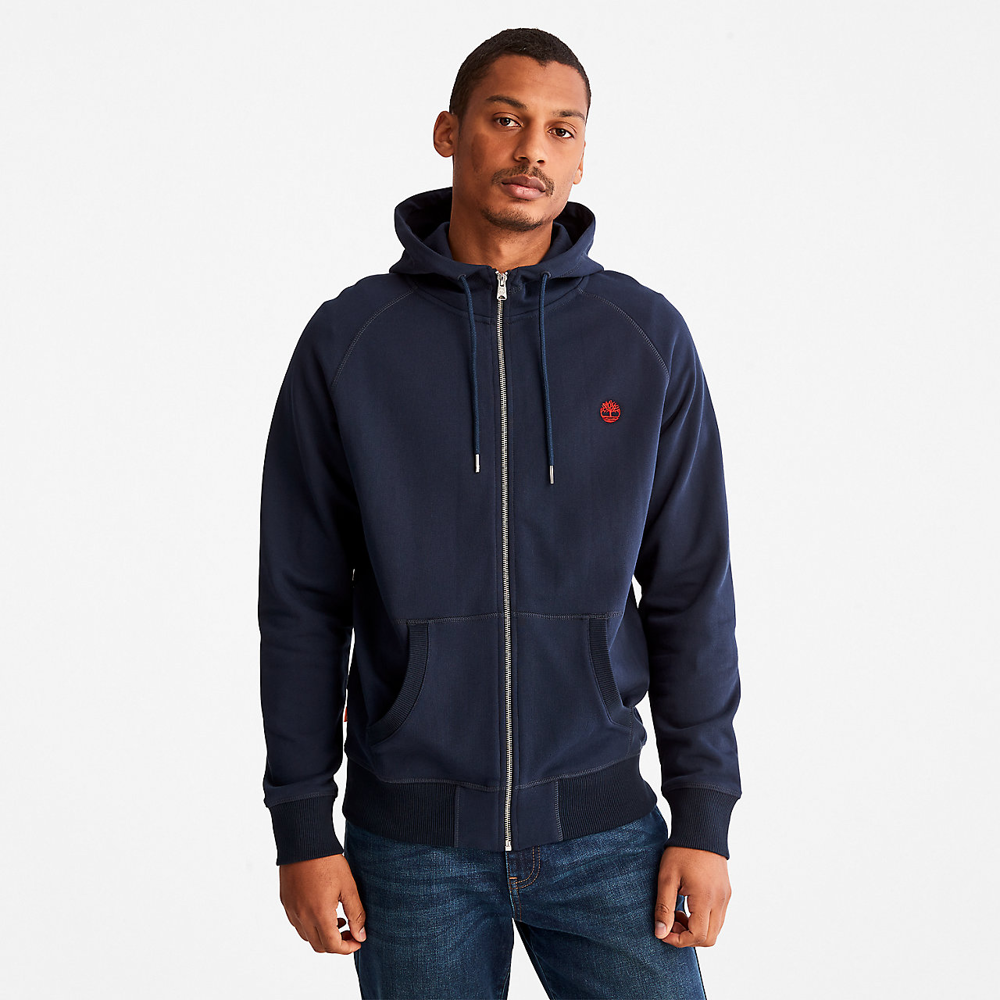 83% cotone / 17% poliestere. Tessuto spazzolato in poliestere e cotone manopesca. Logo Timberland® ad albero ricamato sul petto. Taglio dritto. Fondo manica e fondo capo a costine. Tasche a marsupio.