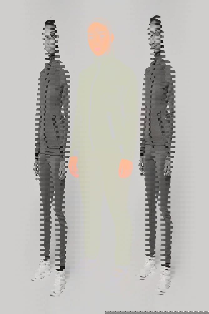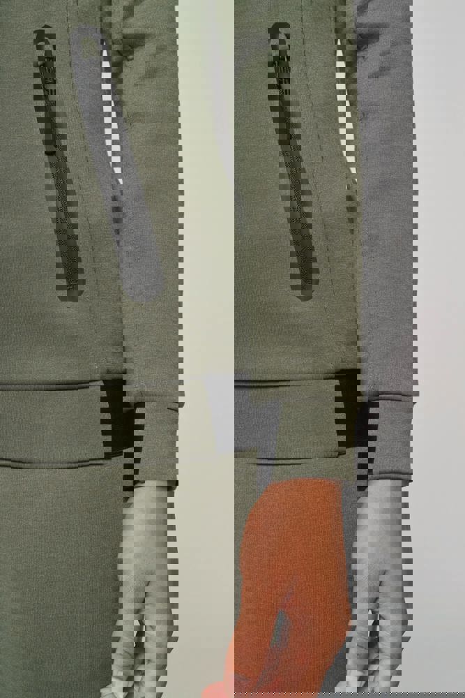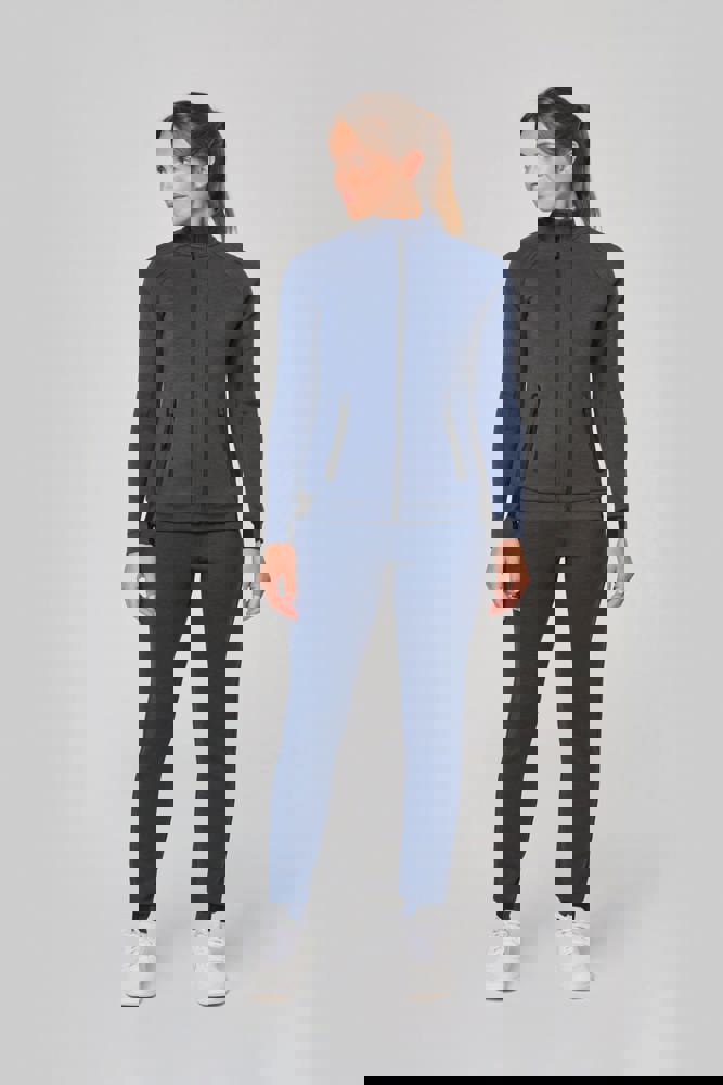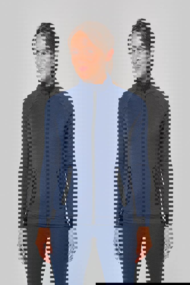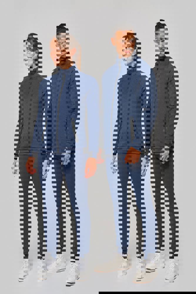 94% poliestere / 6% elastan (79% poliestere / 15% viscosa / 6% elastan per il colore melange). Taglio aderente. Materiale ultra comodo. Chiusura con zip. 2 tasche con zip sul davanti e finitura termosaldata. Fondo manica e fondo capo stretti con una parte elasticizzata Black su tutti i colori e Dark Grey sull'erica di Ash Heather (anche le chiusure). Ideale da indossare con i pantaloni tuta PA1009 per uno stile totalmente "urban apparel".
