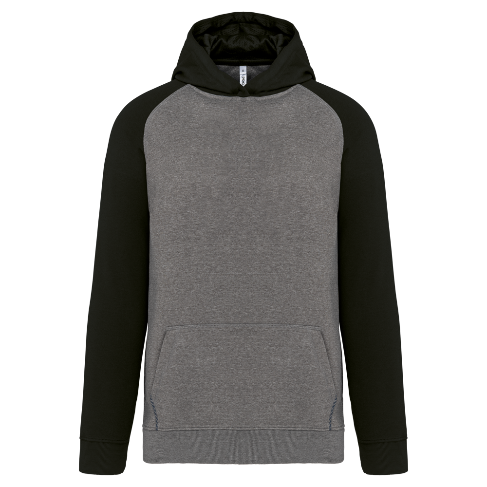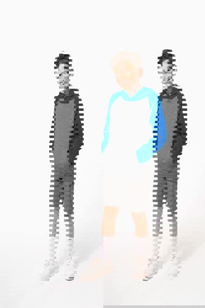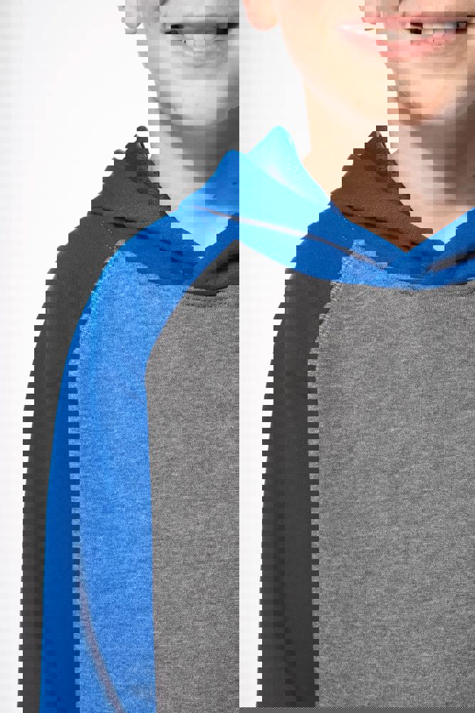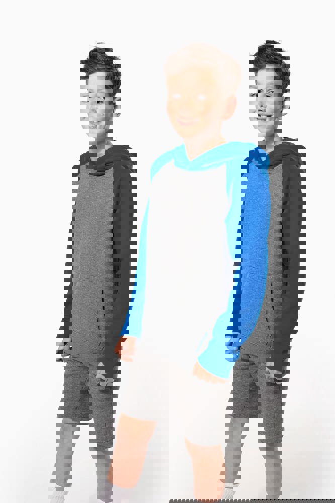 65% poliestere / 35% cotone. Felpa garzata. Maniche raglan e cappuccio a contrasto. Cappuccio foderato in rete tono su tono. Tasche a canguro con tasca fluorescente per cellulare. Passante per auricolari. Polsini e fondo capo a costina doppia 2 x 2.