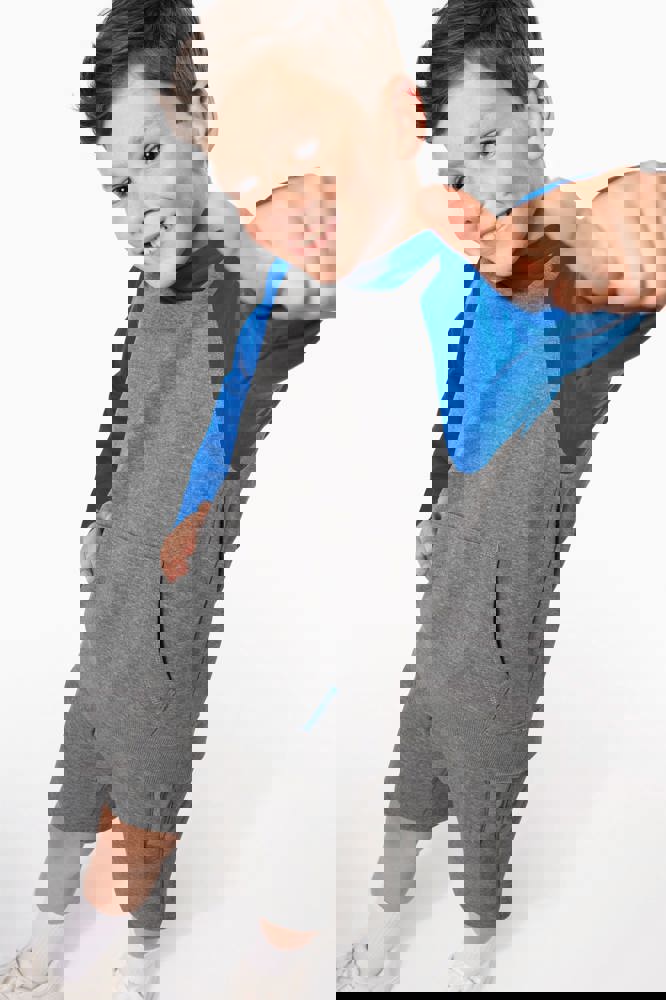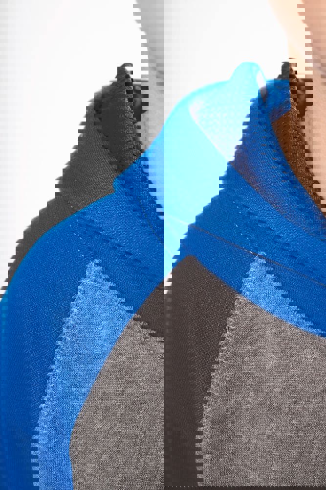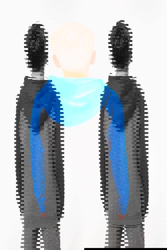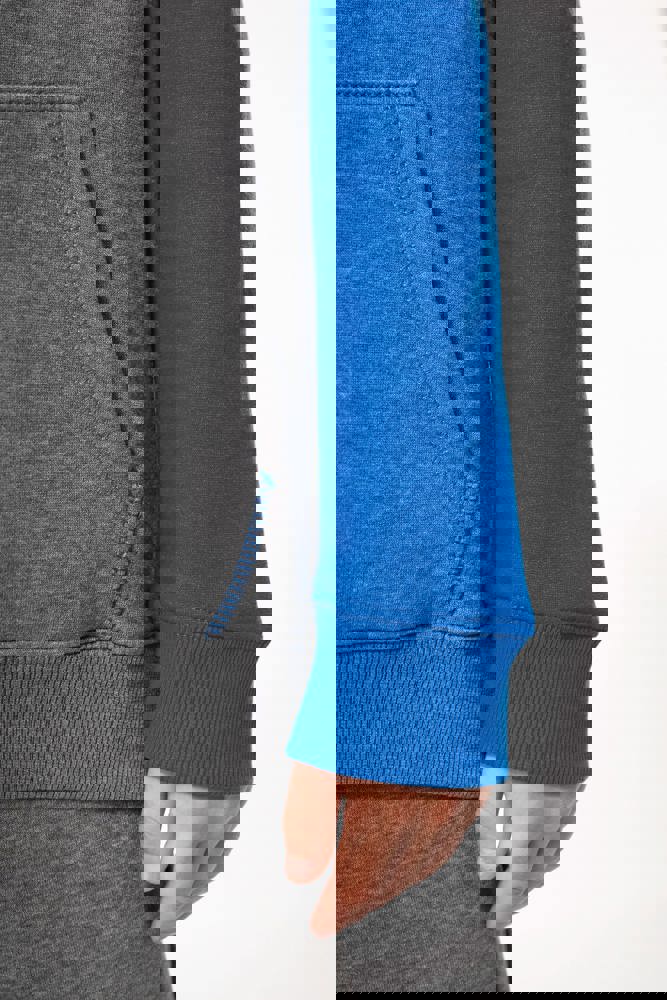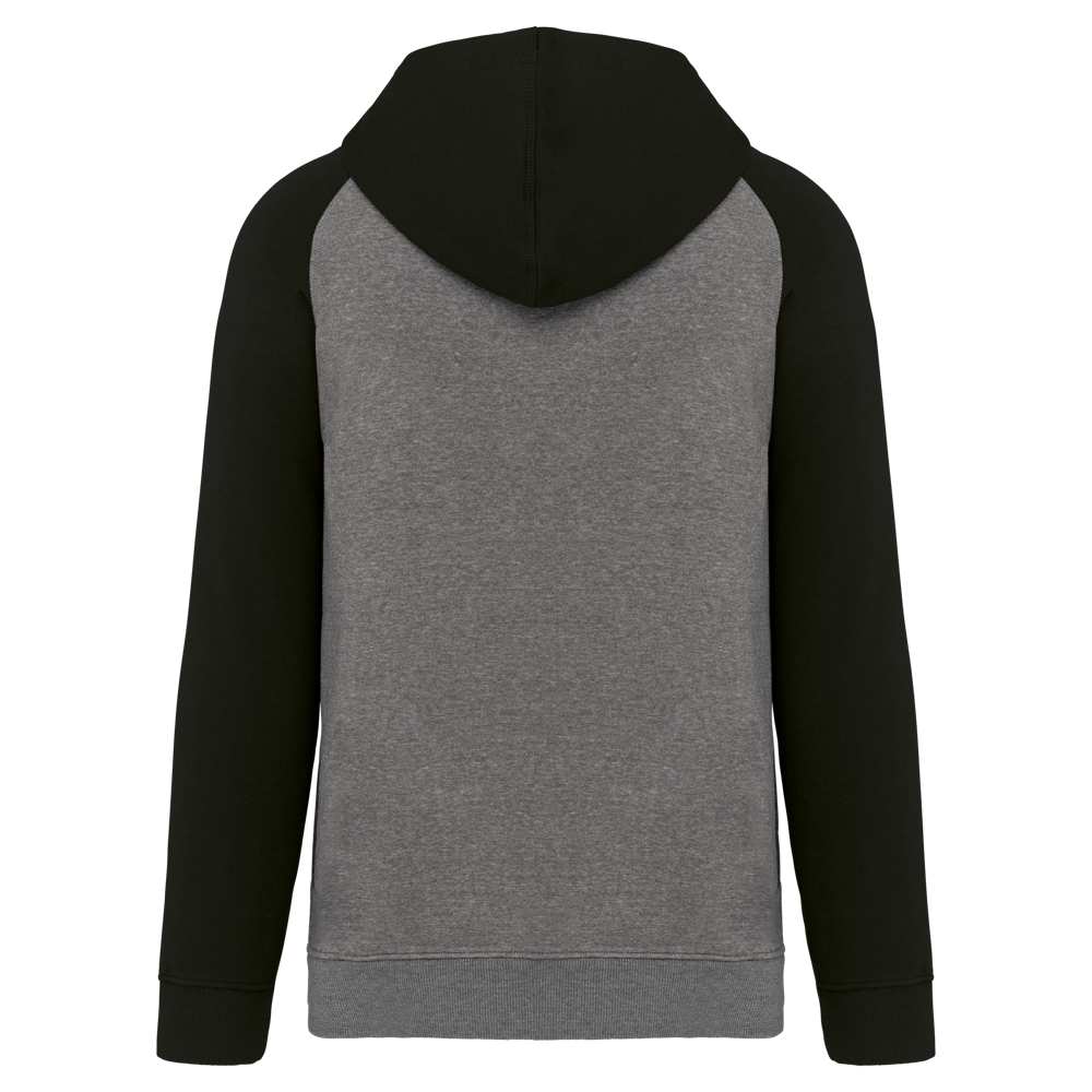 65% poliestere / 35% cotone. Felpa garzata. Maniche raglan e cappuccio a contrasto. Cappuccio foderato in rete tono su tono. Tasche a canguro con tasca fluorescente per cellulare. Passante per auricolari. Polsini e fondo capo a costina doppia 2 x 2.