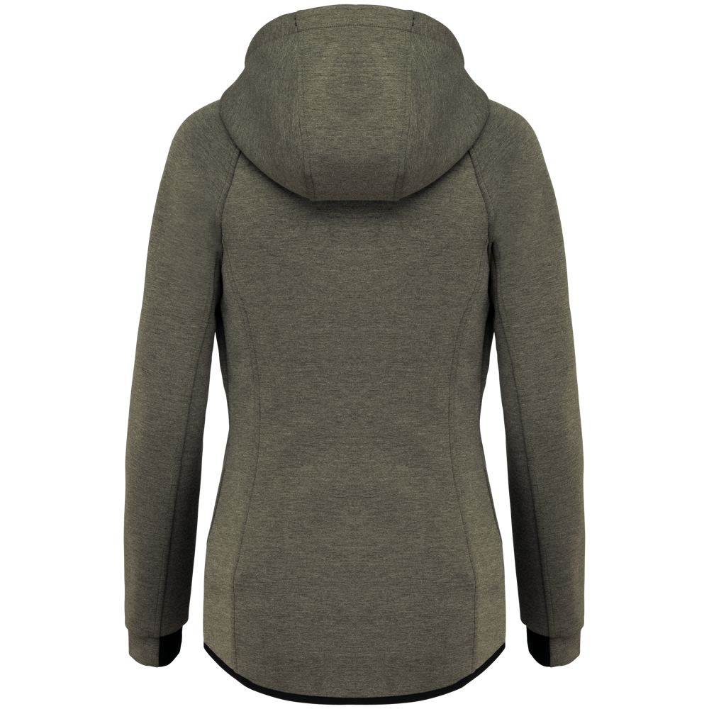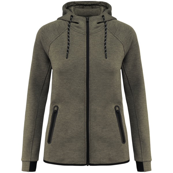 94% poliestere/ 6% elastan (79% poliestere/15% viscosa/ 6% elastan per i colori melange). Taglio aderente. Materiale ultra comodo. Chiusura con zip. 2 tasche con zip sul davanti e finitura termosaldata. Cappuccio con fodera jersey 65% poliestere/ 35% viscosa con coulisse bicolore e finitura puntale in plastica. Fondo manica stretto con una parte elastica a contrasto. Fondo capo con finitura a sbieco a contrasto. Black su tutti i colori e Dark Grey sull'erica di Ash Heather (anche le chiusure).