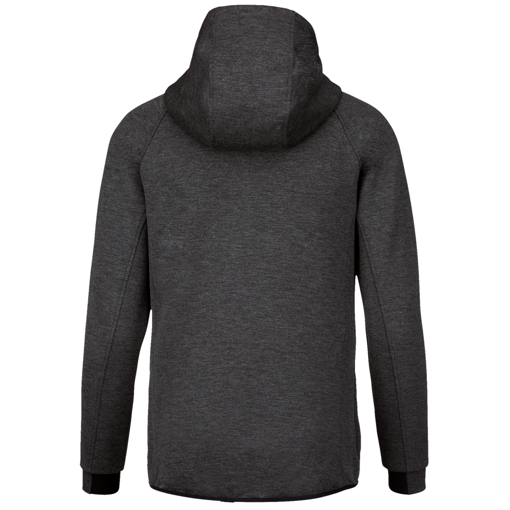 94% poliestere/ 6% elastan (79% poliestere/15% viscosa/ 6% elastan per i colori melange). Materiale ultra comodo. Chiusura con zip. 2 tasche conzip sul davanti e finitura termosaldata. Cappuccio con fodera jersey 65% poliestere/ 35% viscosa con coulisse bicolore e finitura puntale in plastica. Fondo manica stretto con una parte elastica a contrasto. Fondo capo con finitura a sbieco a contrasto. Black su tutti i colori e Dark Grey sull'erica di Ash Heather (anche le chiusure).