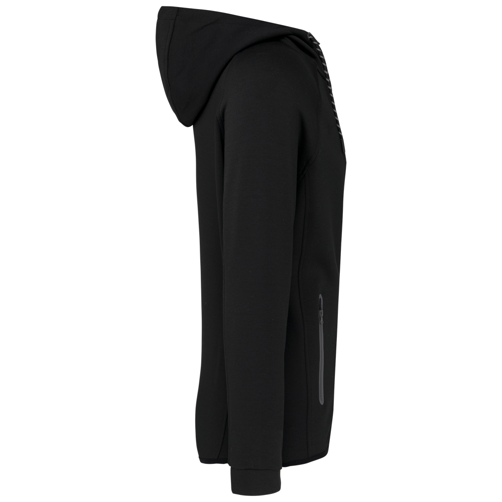 94% poliestere/ 6% elastan (79% poliestere/15% viscosa/ 6% elastan per i colori melange). Materiale ultra comodo. Chiusura con zip. 2 tasche conzip sul davanti e finitura termosaldata. Cappuccio con fodera jersey 65% poliestere/ 35% viscosa con coulisse bicolore e finitura puntale in plastica. Fondo manica stretto con una parte elastica a contrasto. Fondo capo con finitura a sbieco a contrasto. Black su tutti i colori e Dark Grey sull'erica di Ash Heather (anche le chiusure).